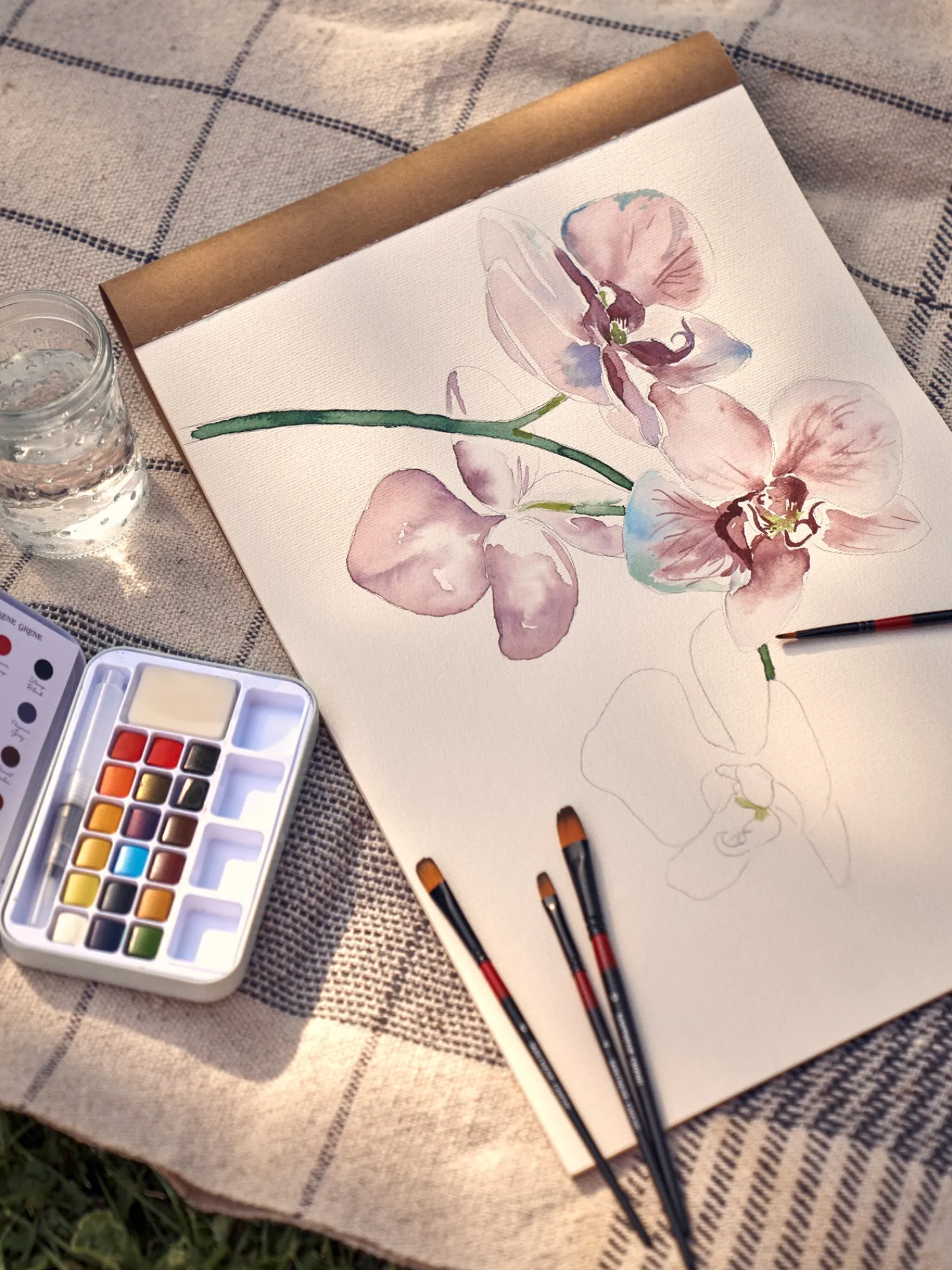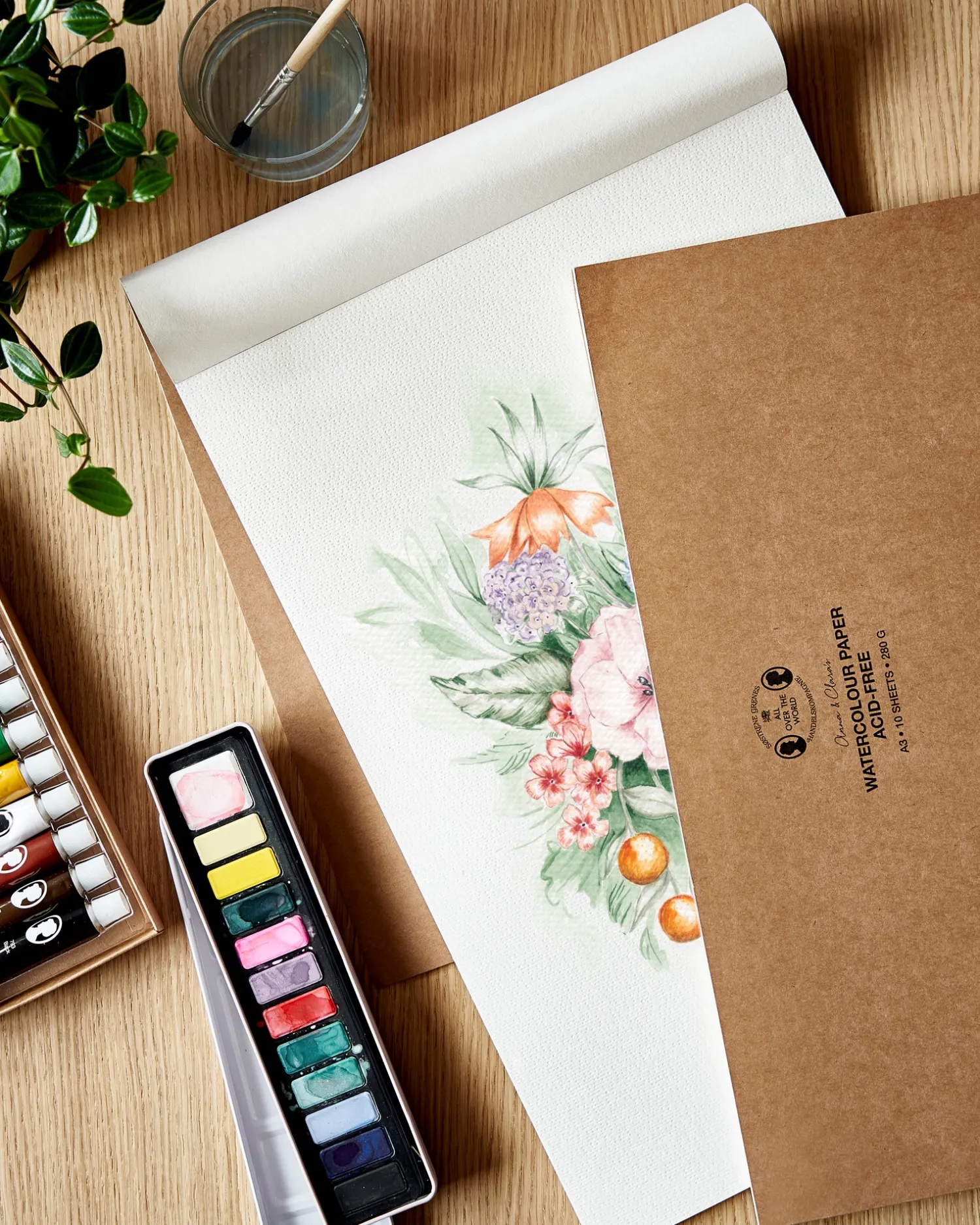 Søstrenes akvarellblokk inneholder ti ark med 280 gsm 100 % FSC®-sertifisert papir.«Kreative sysler er blant livets store gleder», mener Anna.