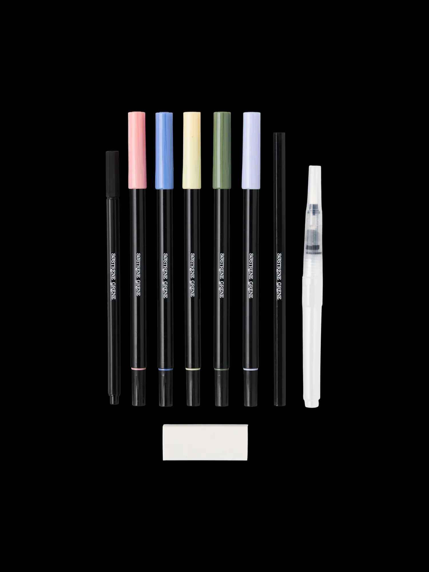 Søstrenes akvarellsett inneholder en palett, penseltusjer, en vannpensel, en tynn tusj, en blyant og et viskelær.