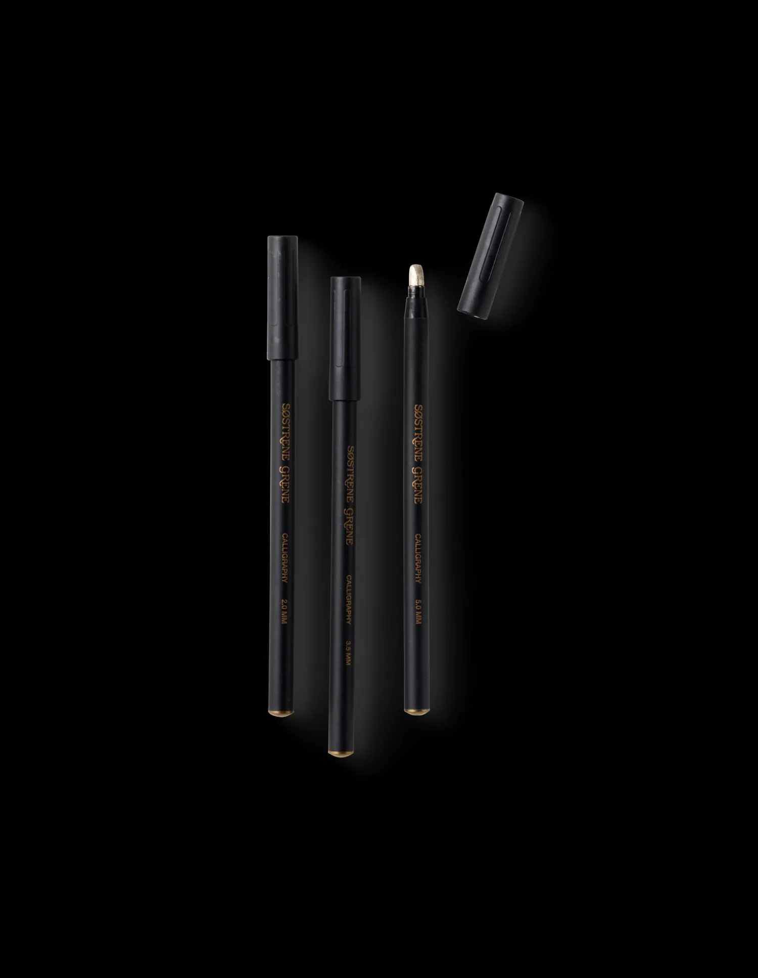 Søstrenes kalligrafisett består av tre penner i tre størrelser: 2,0 mm, 3,5 mm og 5,0 mm. Blekket er vannbasert.