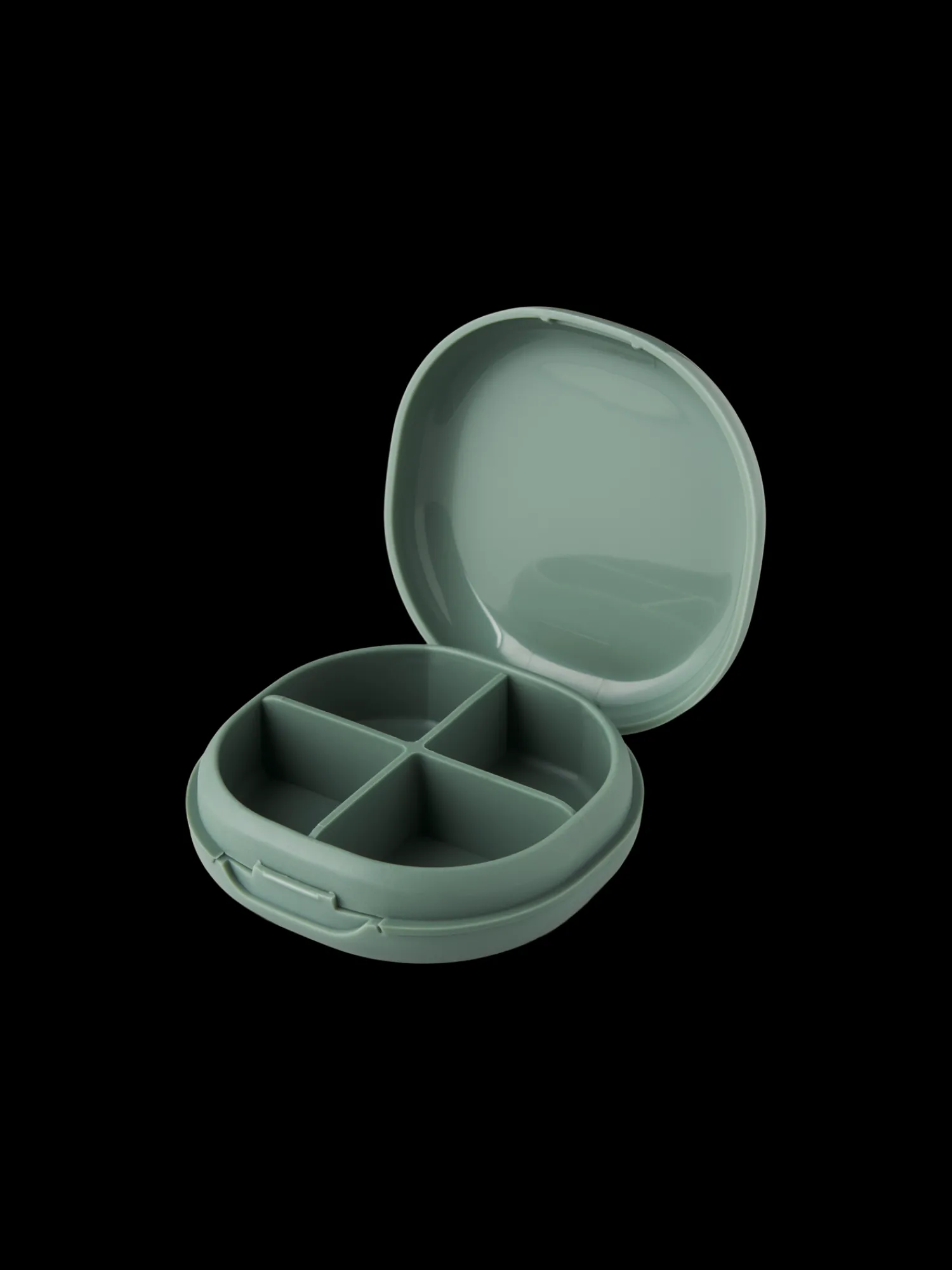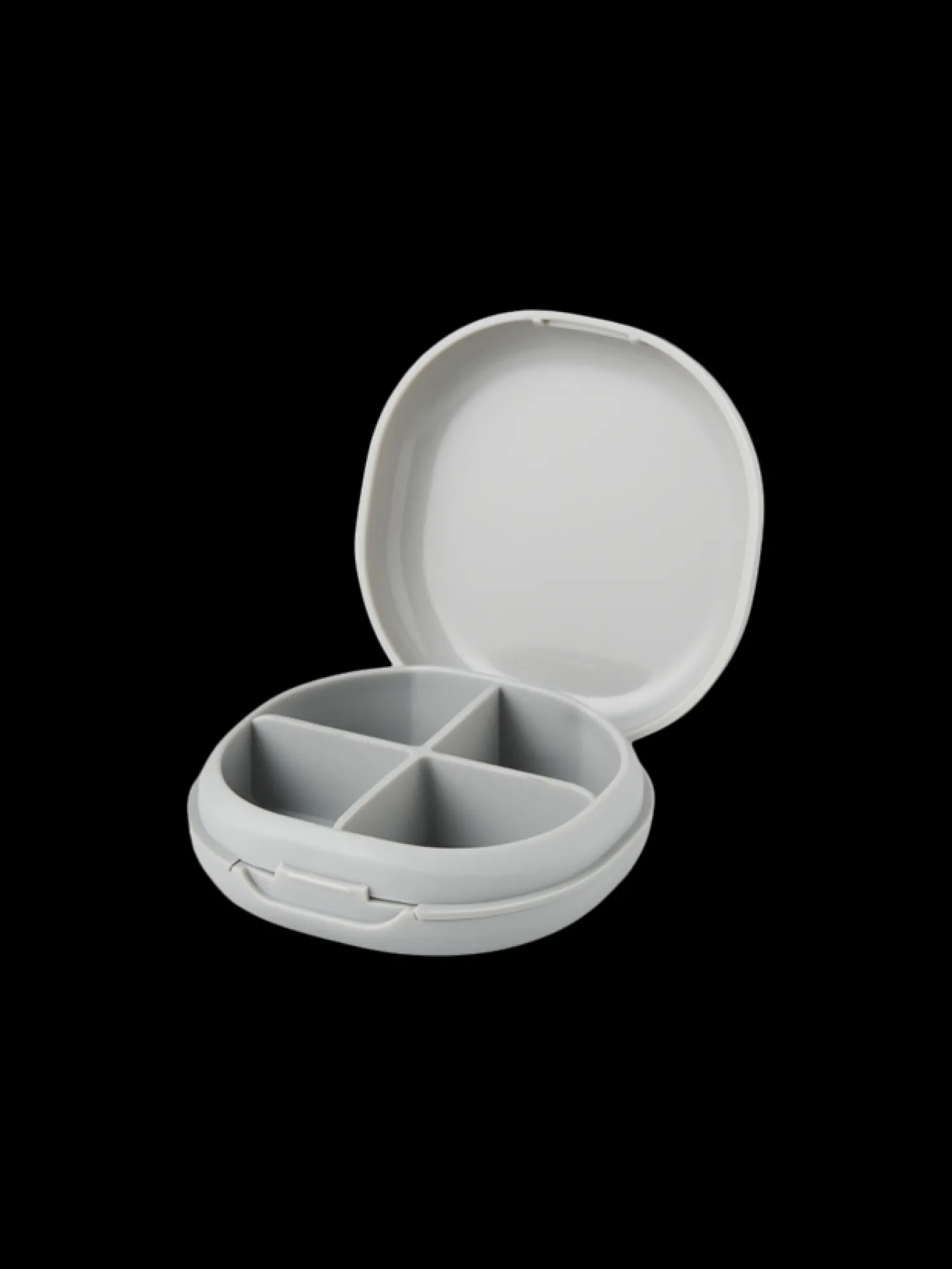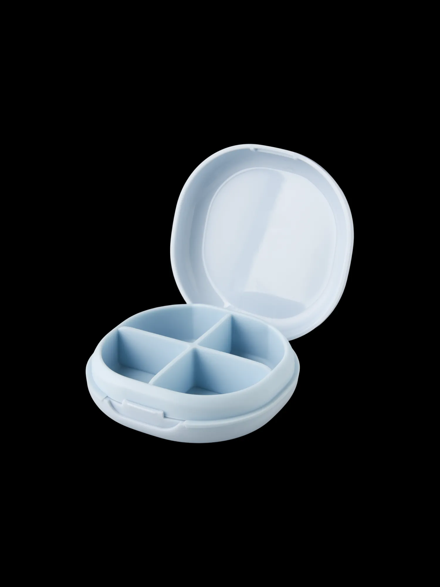 Søstrenes reisepilleeske er laget av polypropylen og silikon, og den er Ø7,5 x 2,5 cm.