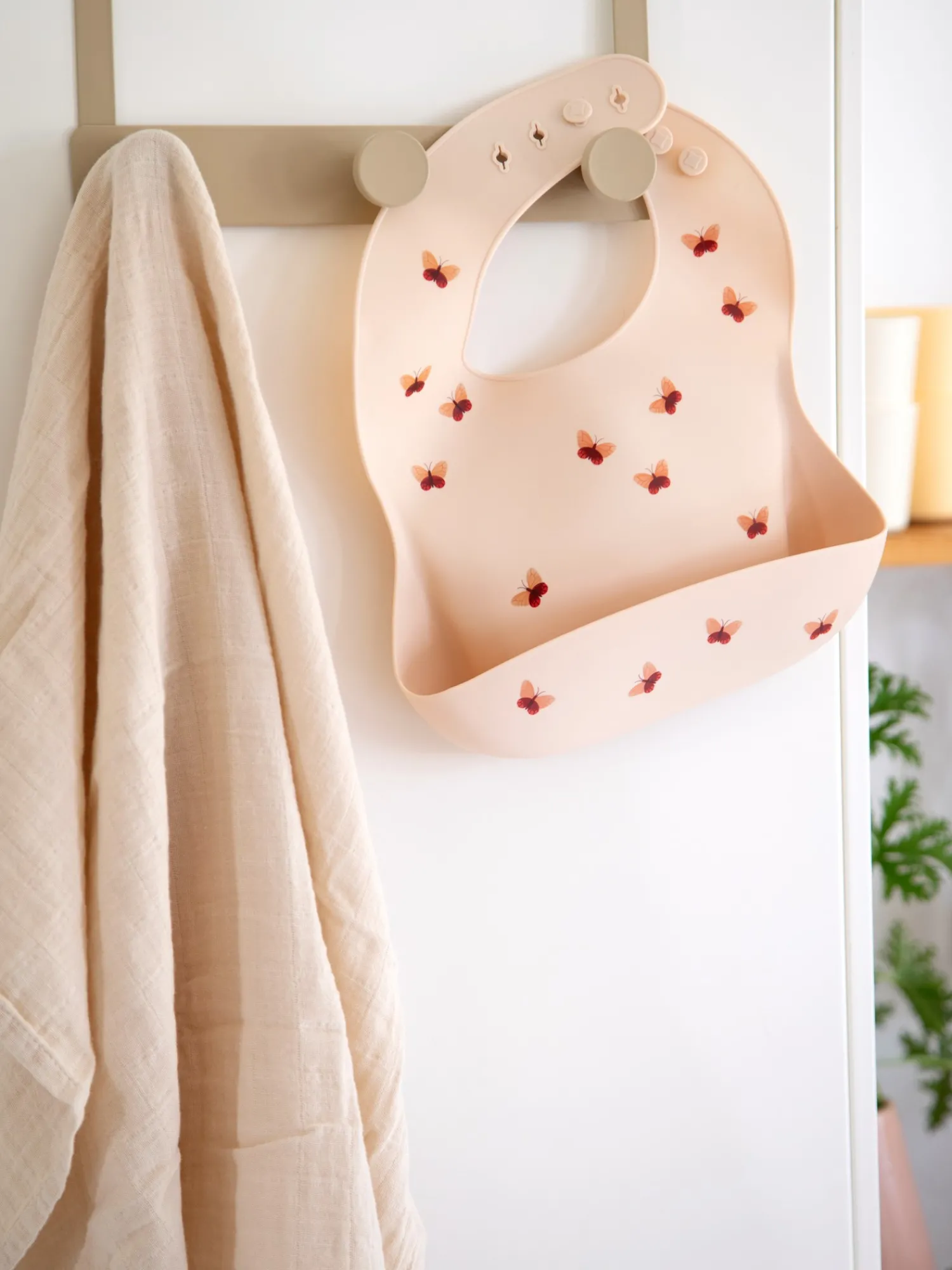 Denne smekken av silikon fra Mushie er laget av næringsmiddelgodkjent silikon. Den gjør det enklere å holde den lille og omgivelsene rene. Den dype lommen fanger mesteparten av maten, slik at det ikke blir søl på gulvet og på den minstes klær. De avrundede og innebygde nakkefestene sørger for komfortabel passform.Søstrene anbefaler at De rengjør produktet med varmt såpevann.Produktet skal alltid brukes under tilsyn av voksne. Kontroller produktet før bruk. Hvis det har tegn på skader eller svekkelser, må det kasseres.