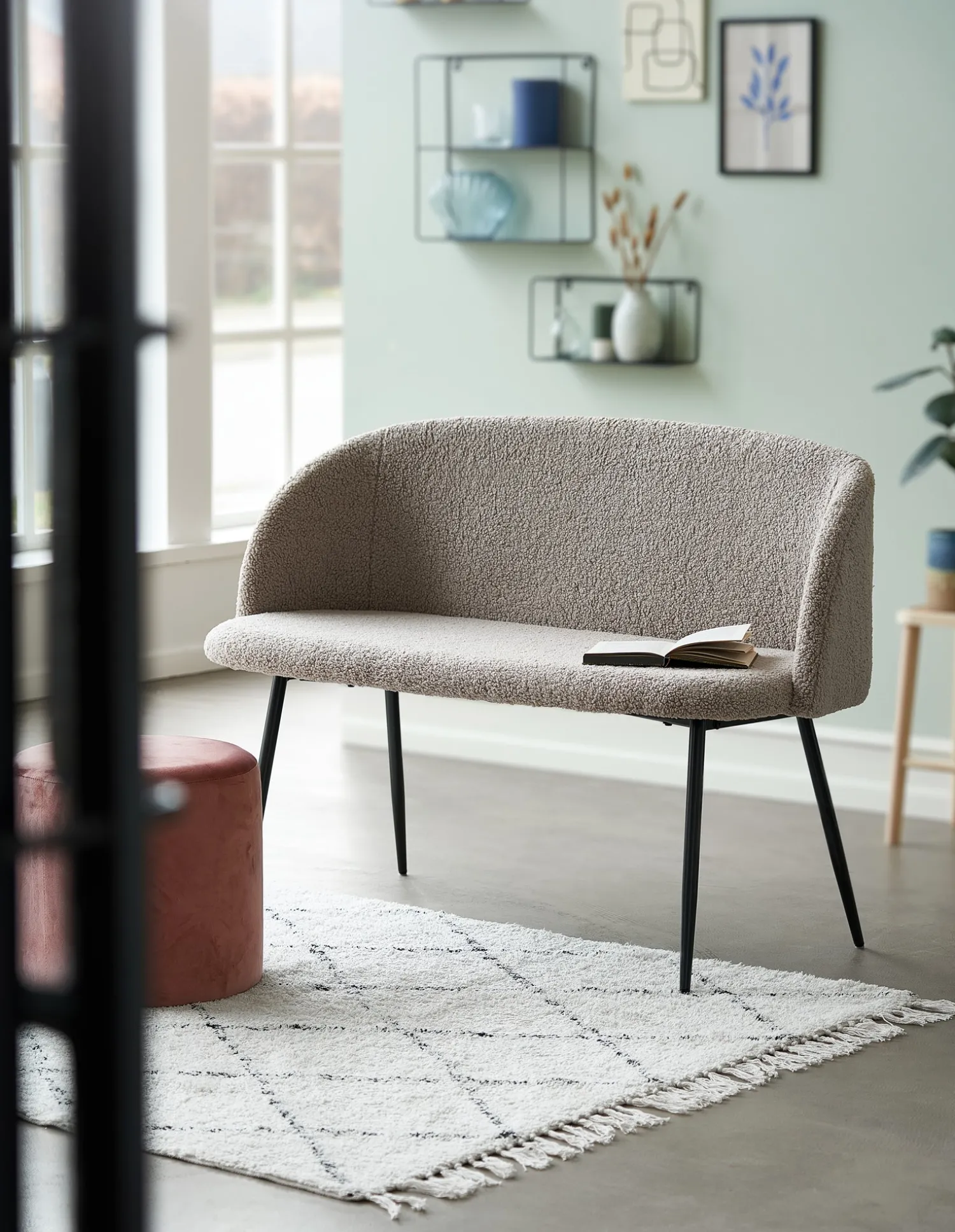 Anna og Clara har innredet entreen med varme farger og naturlige materialer. Søstrene har lagt myke tepper på gulvet og hengt fine flettede kunstverk på veggene. «Det skaper en ro og varme som er deilig innbydende for gjestene», sier Clara. Teppet har Clara pyntet med romber, siden hun synes det er så fint på gulvet. Søstrenes teppe er laget av bomull, og det er 190 x 135 cm.