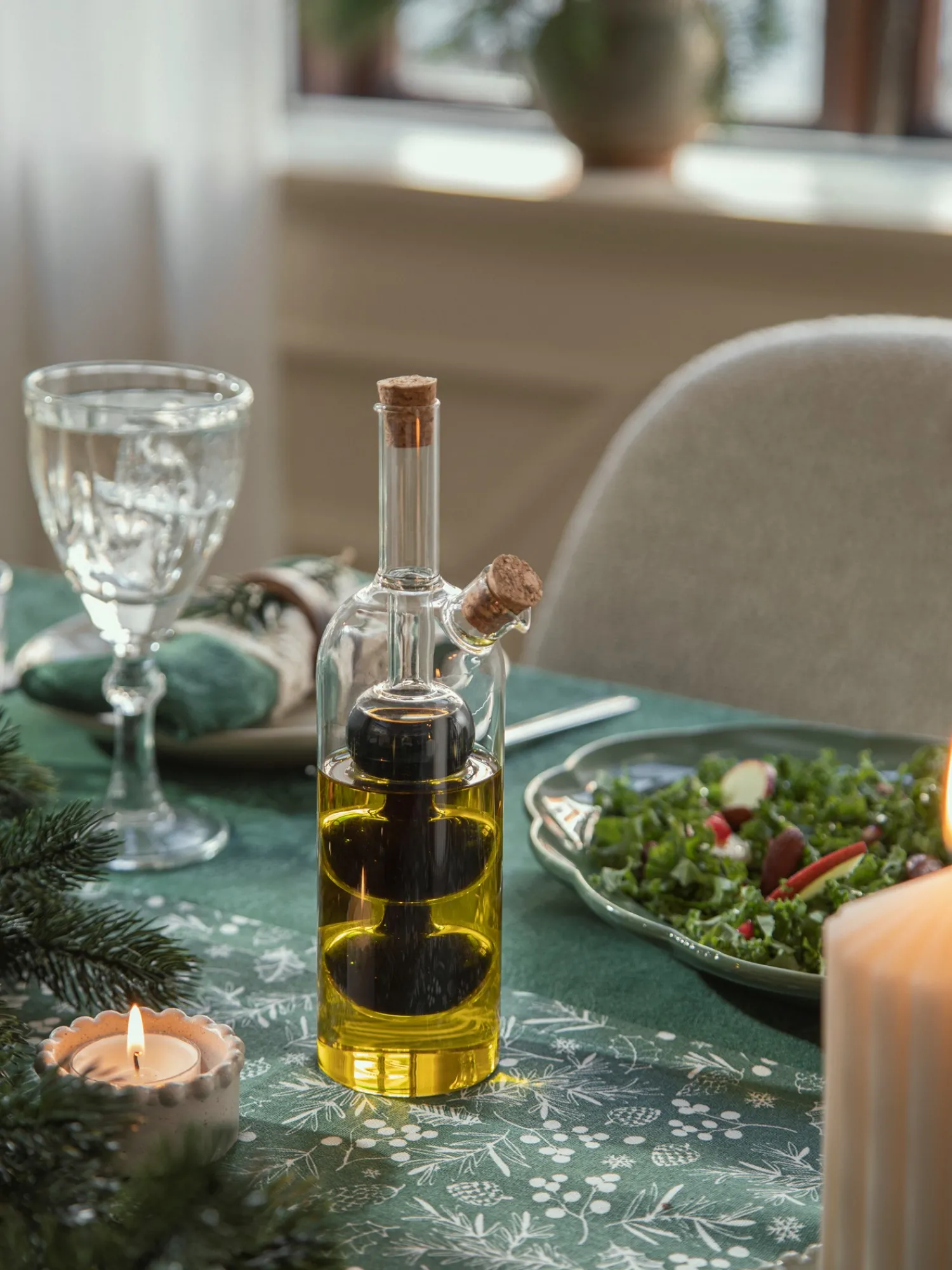 Søstrenes oljeflaske er laget av glass, og den har korker. Den har to kamre. Det ene rommer opptil 70 ml, og det andre rommer opptil 200 ml. De velger selv om De vil fylle flasken med to typer olje, olje og eddik eller noe helt annet.