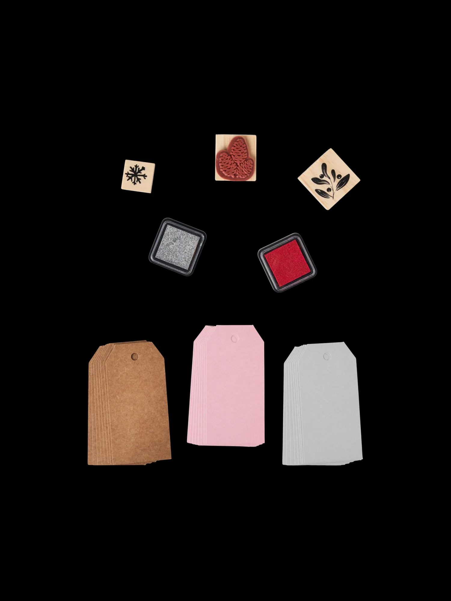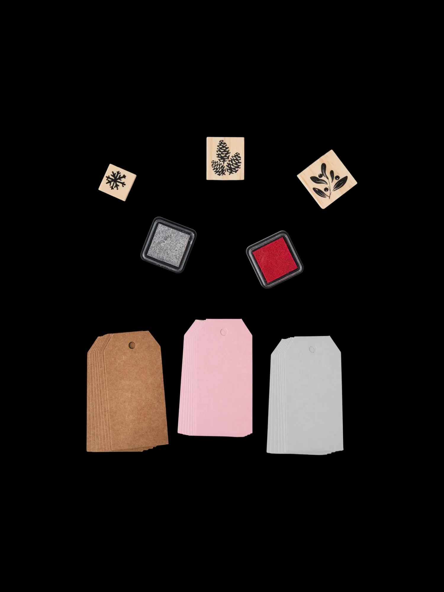 Søstrenes DIY-sett består av 24 manilaetiketter som er laget av 100 % FSC®-sertifisert papir, samt 3 stempler og 2 stempelputer.