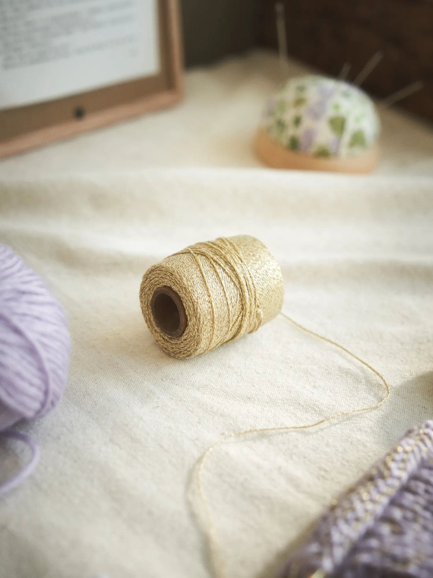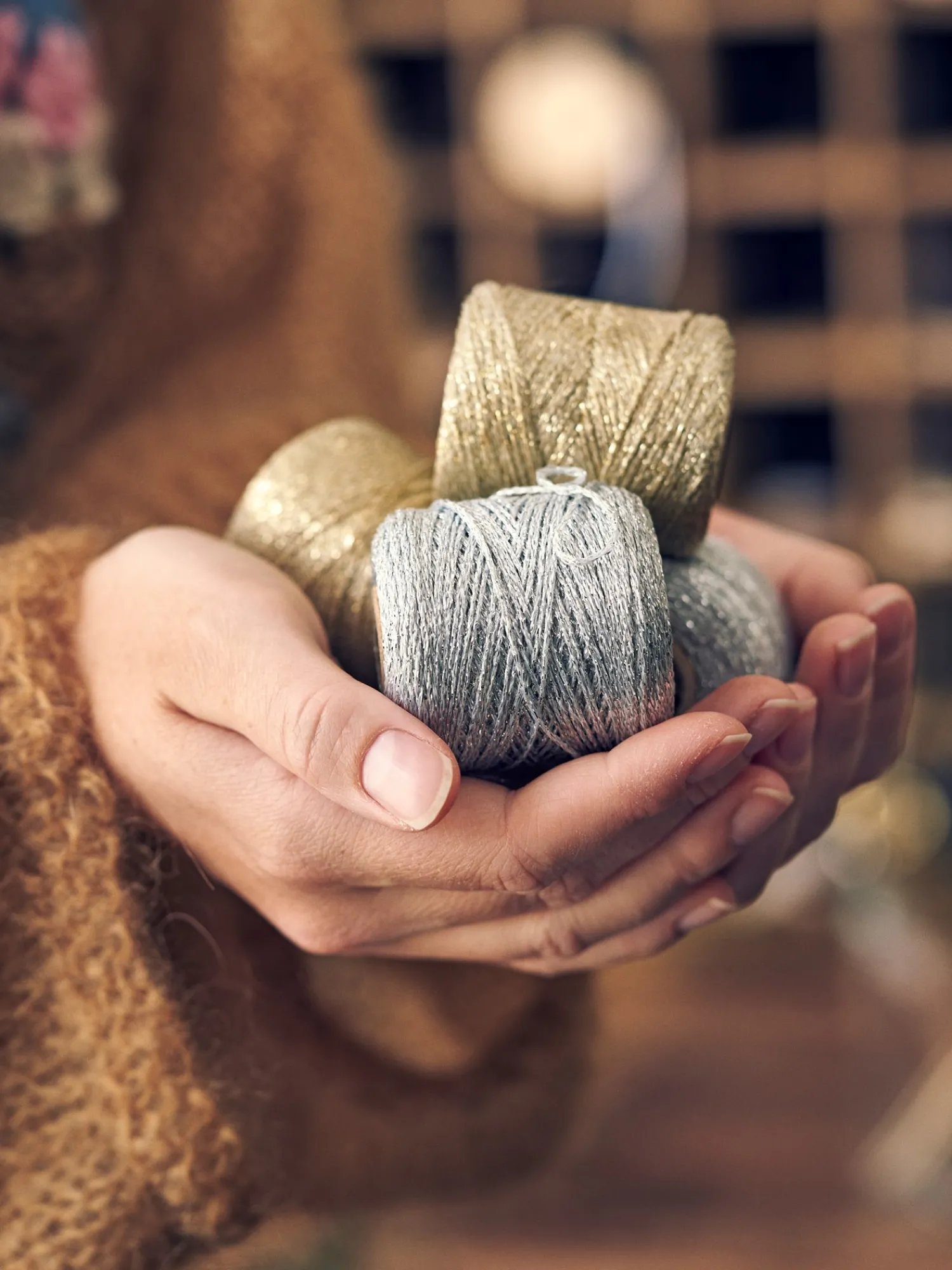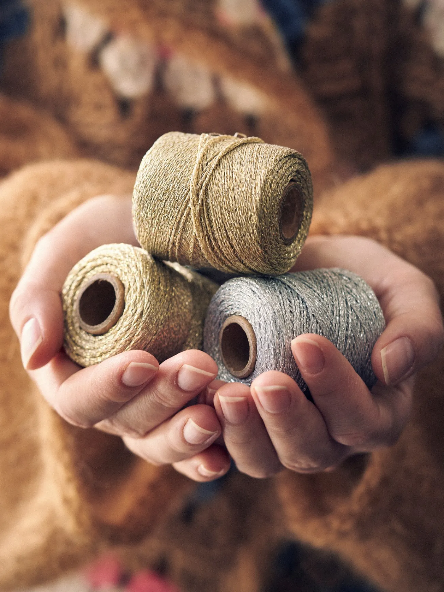 Søstrenes metalliske garn er laget av STANDARD 100 by OEKO-TEX®-sertifisert polyester og bomull. Det er 180 m og veier 25 g.