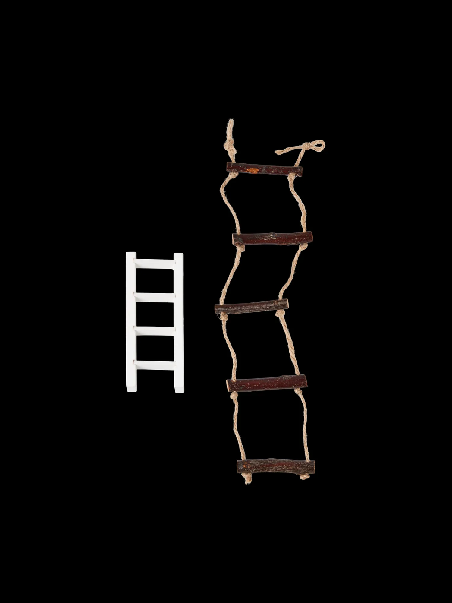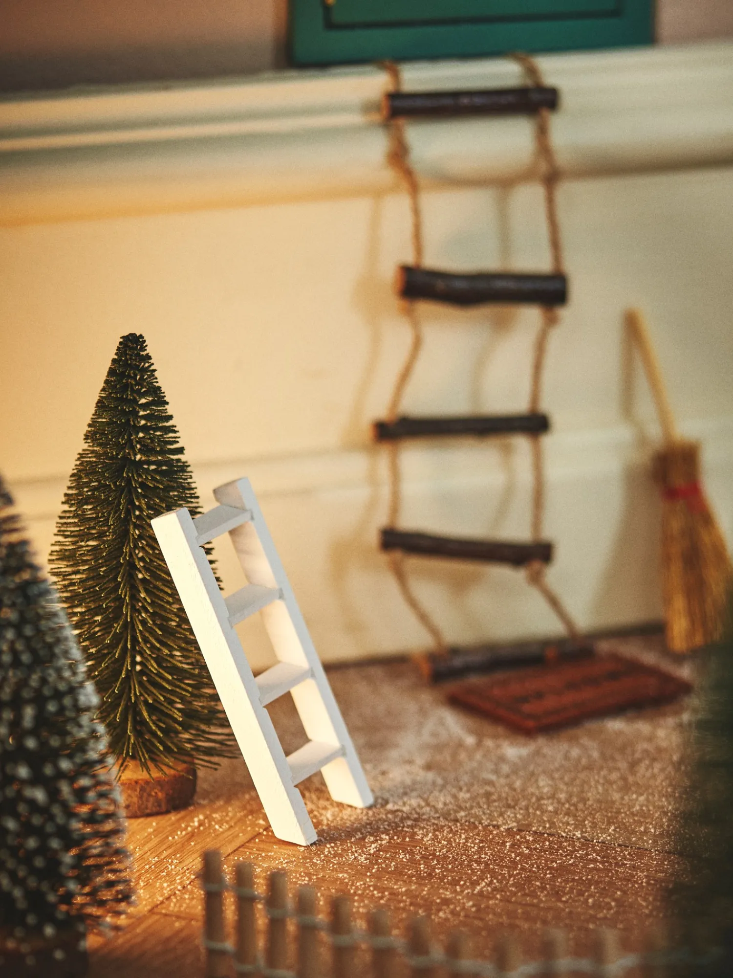 Søstrenes ministige og taustige er laget av 100 % FSC®-sertifisert tregren og furu. Stigen er 3,6 x 9 x 0,8 cm, og taustigen er 22 x 5 cm.De er et flott tilskudd til den lille julebyen Deres, eller de kan brukes i julealvens hus.