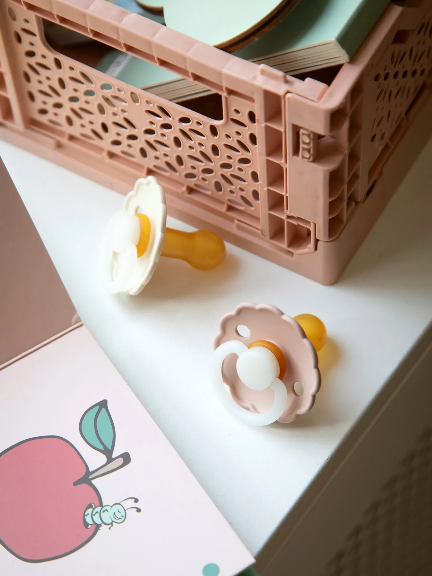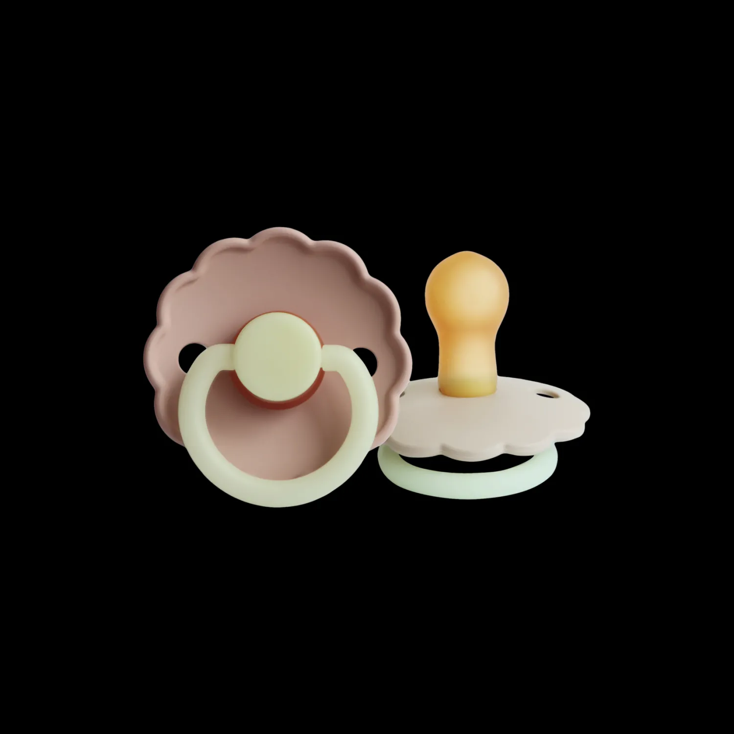 Smokkene Daisy fra det danske merket FRIGG er designet og produsert i Danmark. Pakken inneholder to FRIGG-smokker og én FRIGG-blisterpakning. Smokkene har et click-lock®-system og en ny SilkySoft™-sugedel. Sugedelen er laget av 100 % naturgummi, og den er i størrelse 2, som er perfekt for alderen 6–18 måneder. Sugedelen er rund, og den er 30 mm. Smokkene lyser også svakt i mørket, uten at det skader den lilles øyne. Håndtaket og knotten lyser i mørket, slik at det blir enklere å finne og sette inn babyens smokk om natten.Smokkene Daisy fra FRIGG har bedårende formede kanter som minner om en spesiell blomst: Prestekragen – som er Danmarks nasjonalblomst. Denne pakken inneholder en Blush Night-farget smokk og en Cream Night-farget smokk. Søstrene legger vennlig til at smokkene bør byttes ut etter 4–8 uker av hygieniske årsaker og for å ivareta sikkerheten. De bør alltid undersøke smokken før bruk, og den må kasseres ved det minste tegn på skade eller slitasje.
