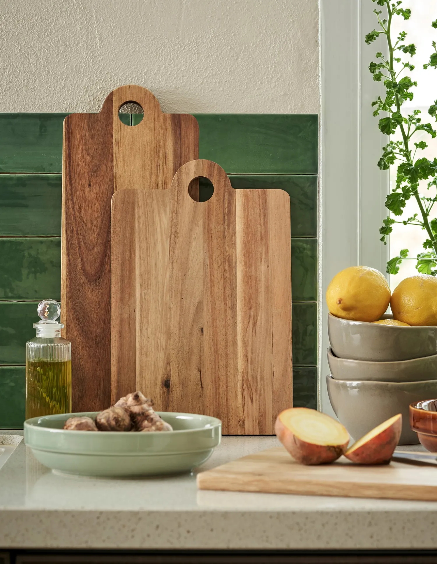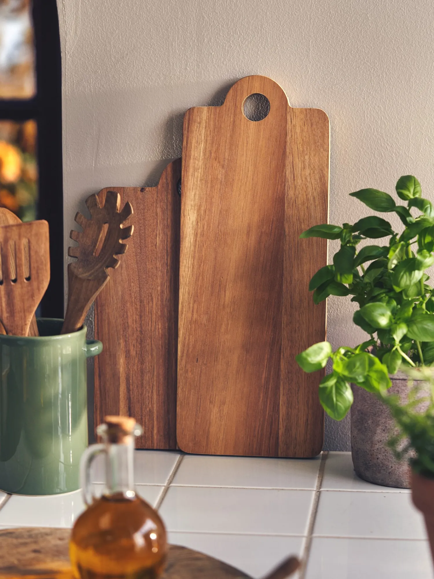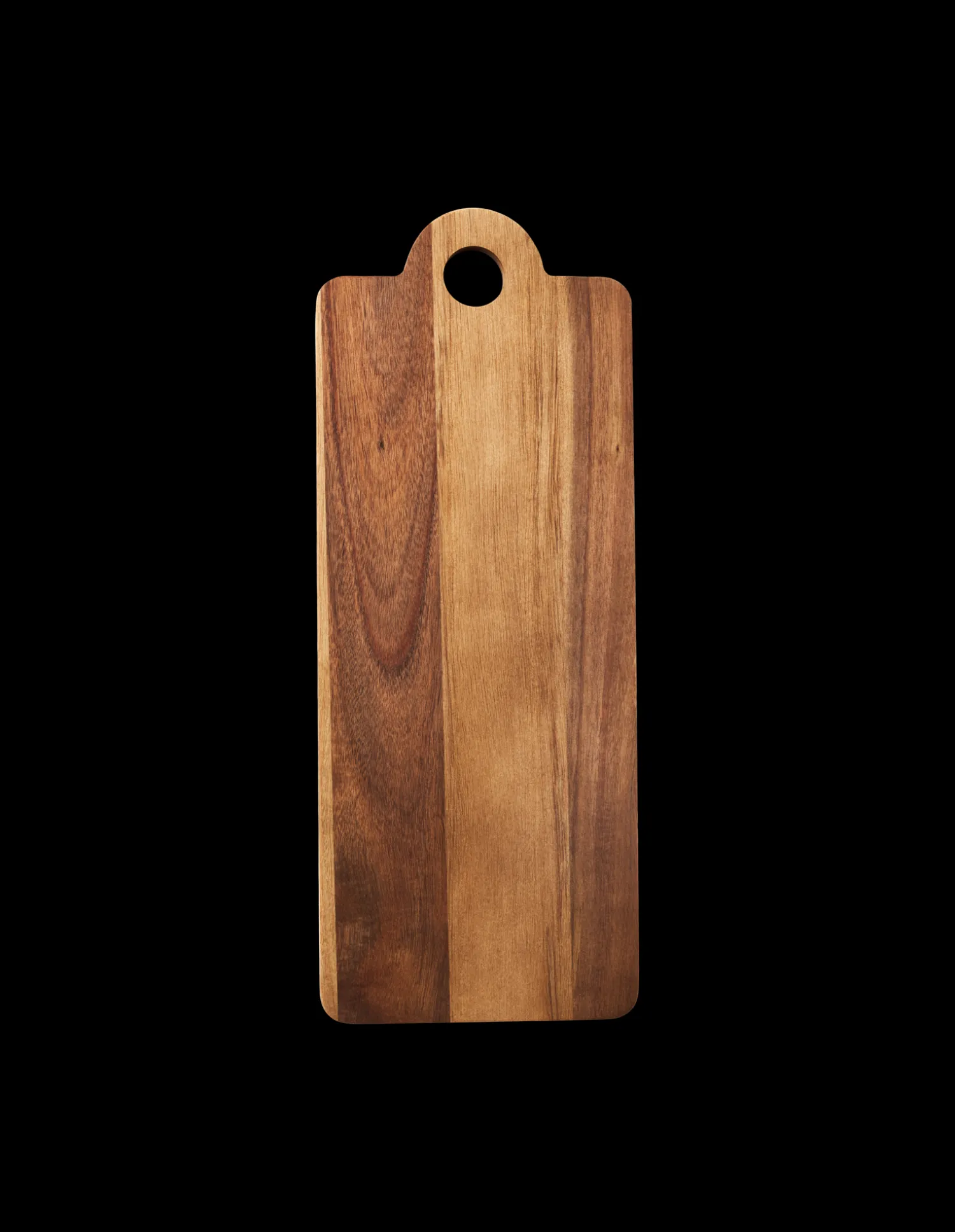 Søstrenes skjærebrett er laget av 100 % FSC®-sertifisert akasie, og det er 16 x 41 cm.Siden akasie er et naturlig materiale, minner søstrene vennlig om at produktet kan avvike noe i farge og mønster.