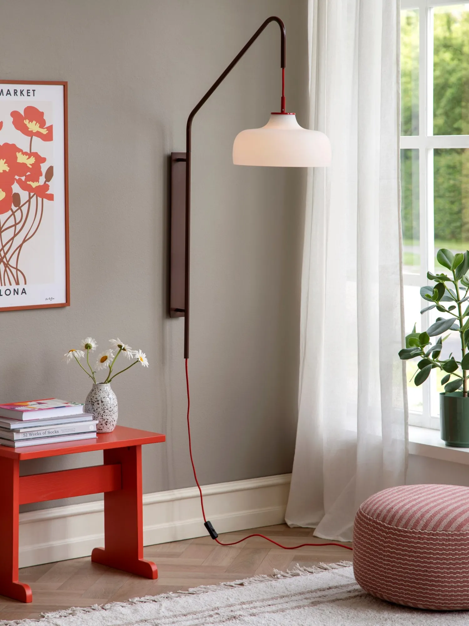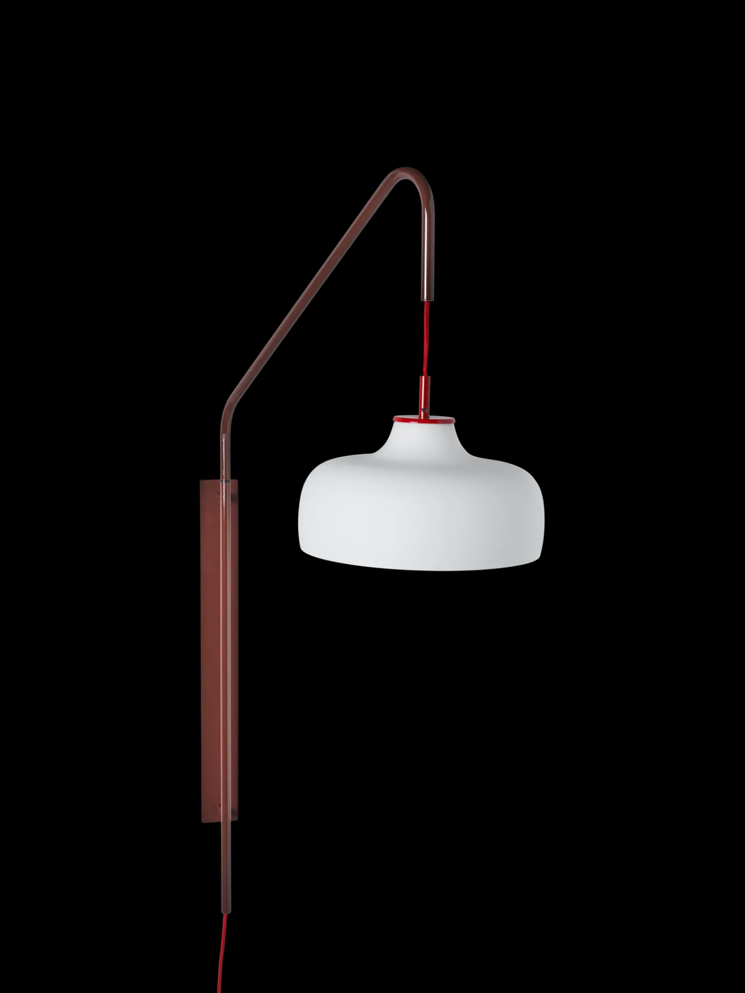 Denne nydelige vegglampen fra Hübsch har en opal avrundet lampeskjerm av glass, som garantert kommer til å lyse opp enhver bolig. Den røde stoffsnoren og den matchende stangen gjør dette til det perfekte valget hvis De ønsker en unik interiørdetalj.