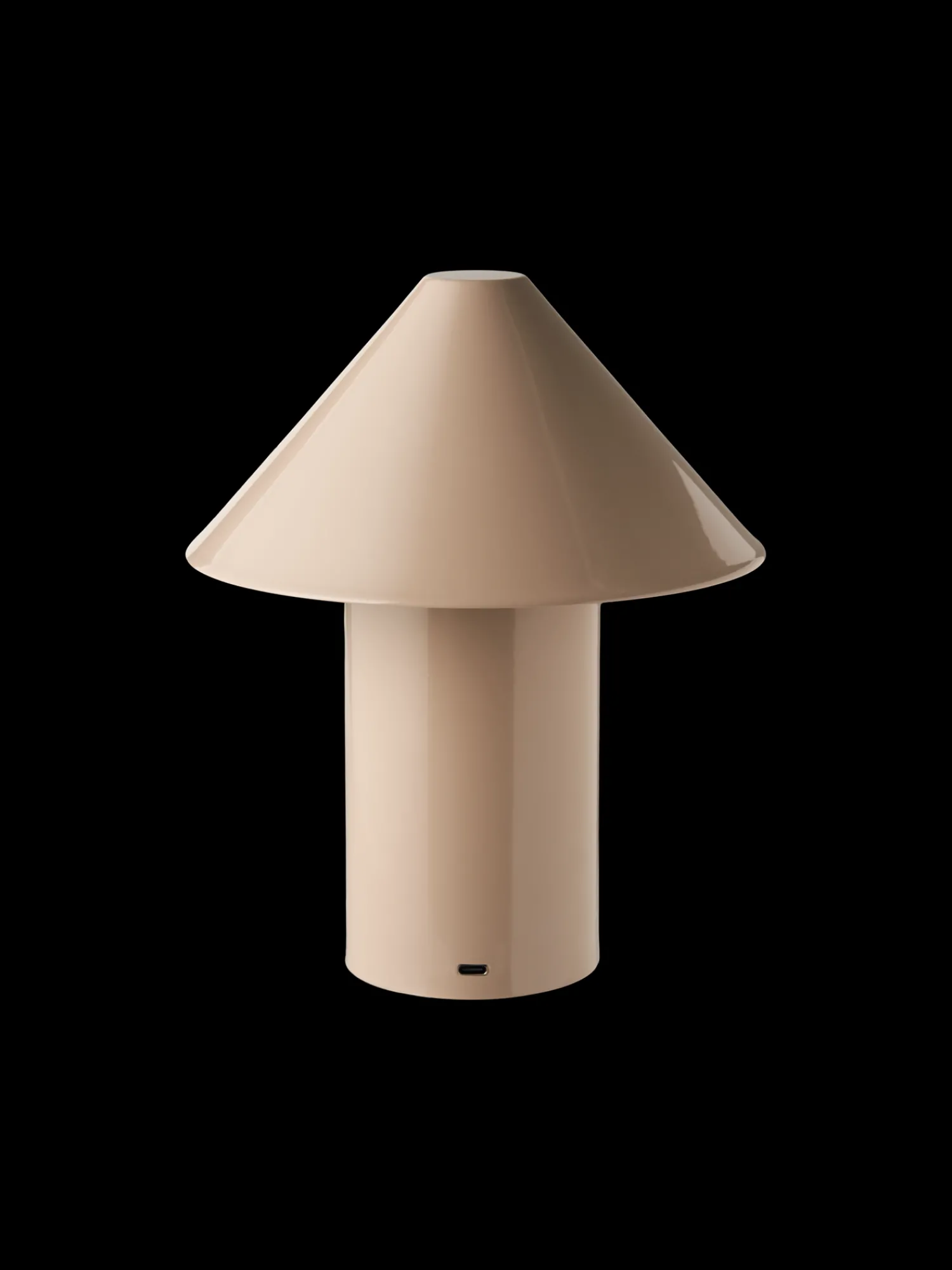 Søstrenes bordlampe har en lampeskjerm som er 18 cm i diameter. Den er 21,5 cm høy, og kabelen er 1 meter. Lampen lades via USB og har tre lysstyrker.