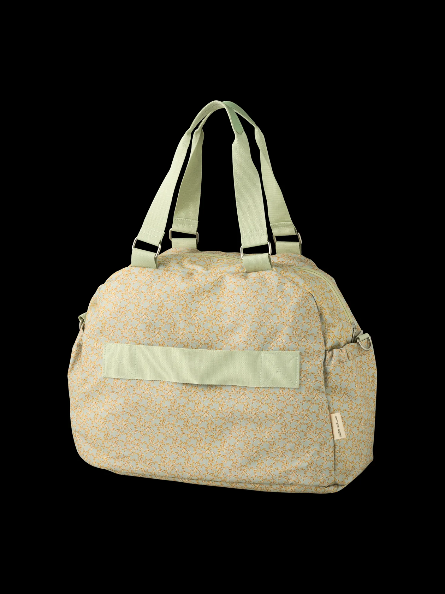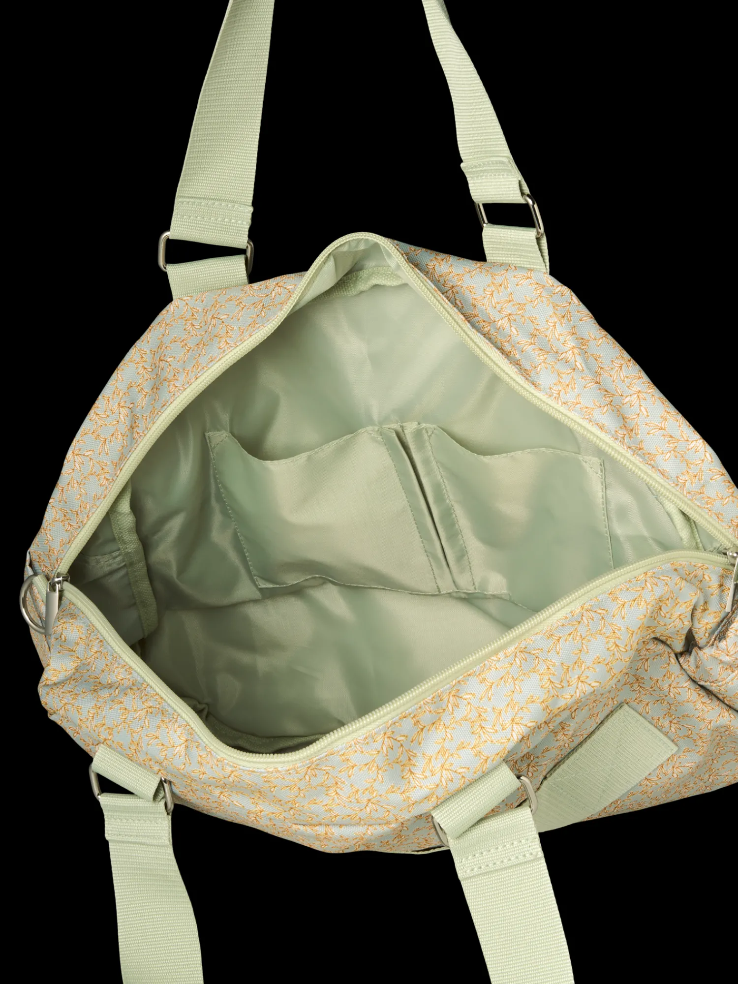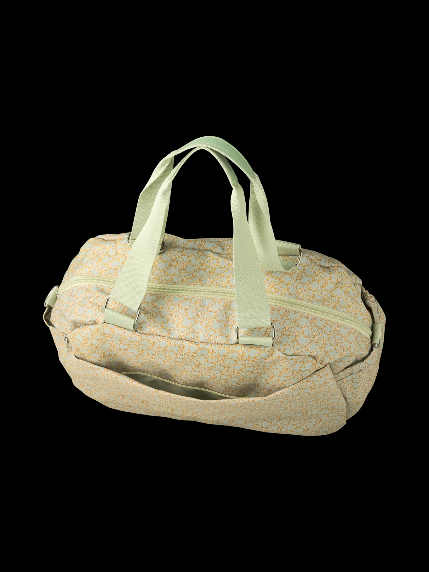 Søstrenes duffelbag har en justerbar skulderstropp, en stor frontlomme samt en stropp på baksiden som kan festes rundt håndtaket på en koffert.