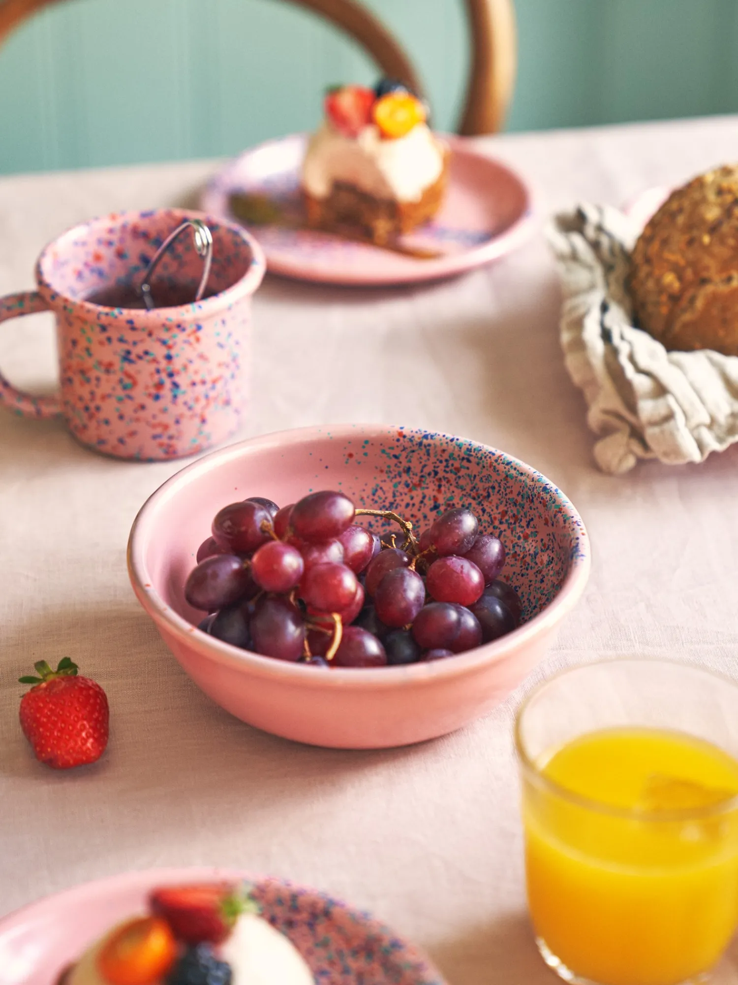 Søstrene minner vennlig om at dette produktet bare er tilgjengelig på nett.Den emaljerte Flow Fest-skålen fra Kapka er 17 cm i diameter. Produktet kan vaskes i oppvaskmaskin.«Det ser nesten ut som konfetti», utbryter nevøen mens han holder opp det fargerike, emaljerte produktet og klirrer det mot Claras skål med et smil. Søstrene har invitert barna på piknik i favorittparken deres. Piknikkurven er fylt med deilig snacks, forfriskende drikke og praktisk servise.«Denne typen servise er veldig praktisk til pikniker, siden det er lett og solid», forklarer Clara. «Helt enig, kjære søster. Men det er også vidunderlig vakkert på et fint dekket bord hjemme», sier Anna med et smil.Søstrene minner vennlig om at De må være forsiktig når De håndterer emaljerte produkter som er fylt med varme væsker.
