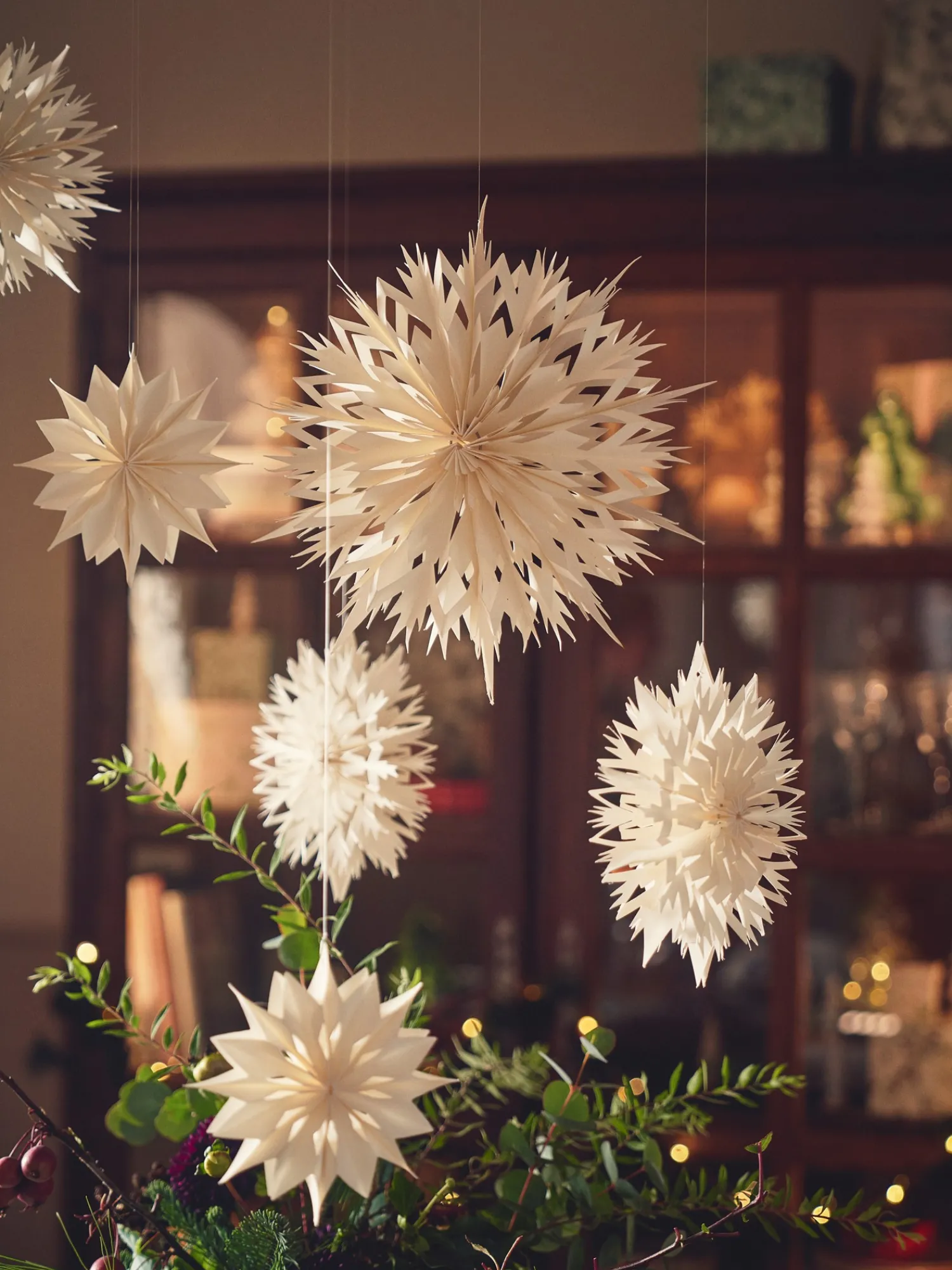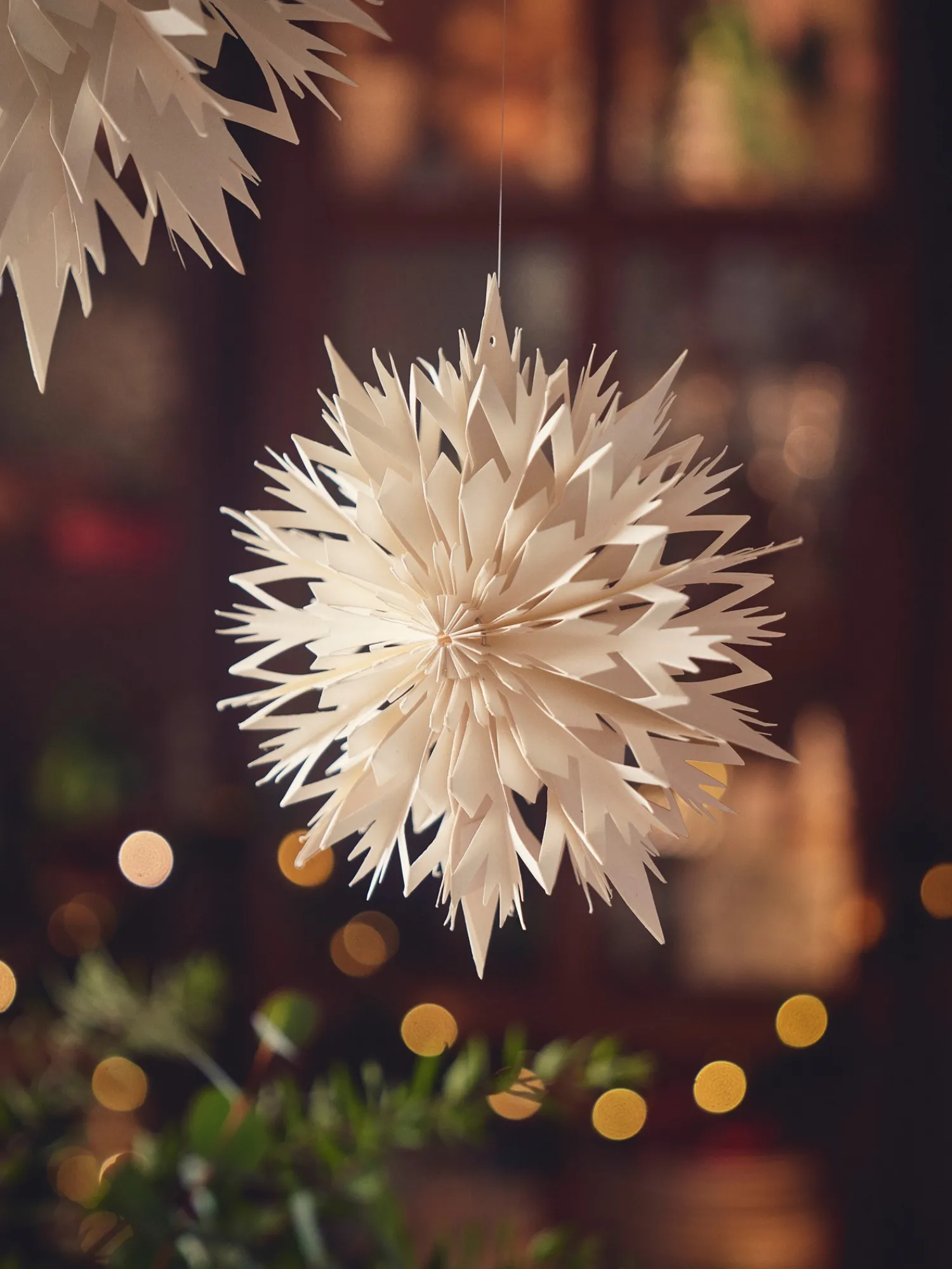 Søstrenes hengende snøkrystall er laget av FSC®-sertifisert papir.La den skinne for seg selv, eller lag en magisk kombinasjon ved å henge den sammen med andre snøkrystaller og stjerner av papir.