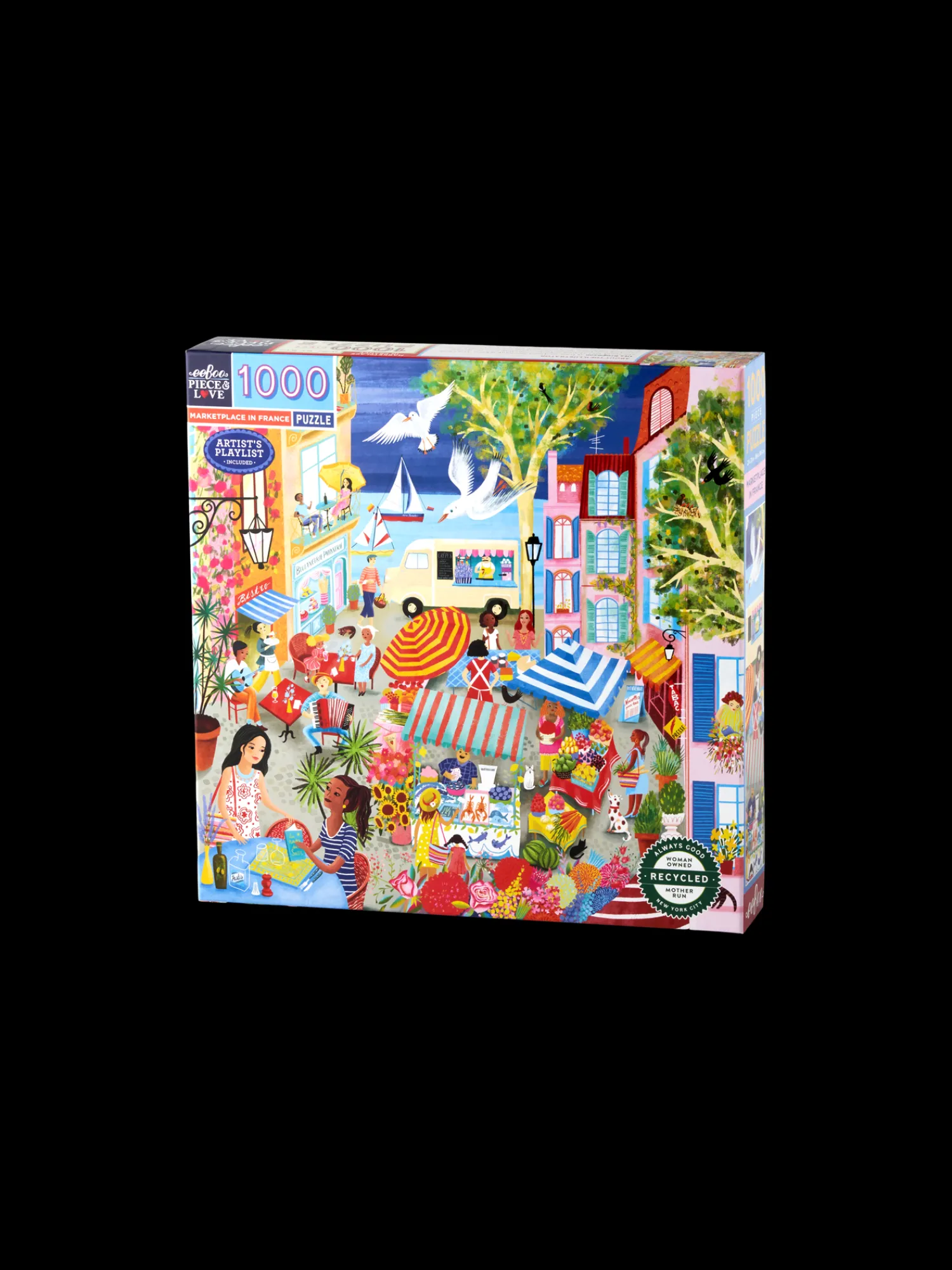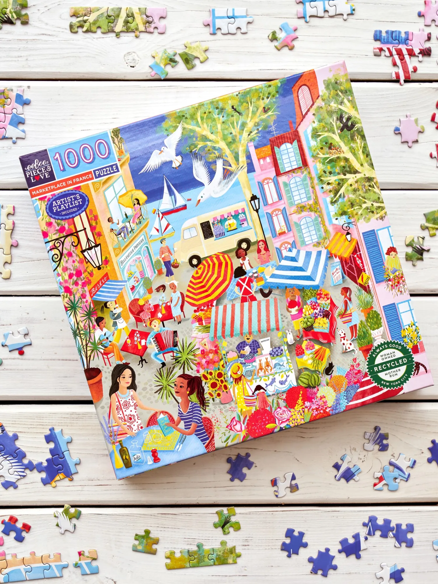 Søstrene minner vennlig om at dette produktet bare er tilgjengelig på nett.Puslespillet Marketplace in France fra eeBoo er laget av papir, og det er 58 x 58 cm når det er ferdig. Puslespillet har 1000 brikker. Illustrasjonen er laget av Uta Krogmann.Enten de koser seg inne på regnfulle dager eller sitter på terrassen når solen skinner, liker Anna og Clara å pusle sammen. «Det er en avslappende aktivitet, og så får man god tid til å snakke sammen mens man pusler», sier Clara.Hun samler metodisk sammen kantbrikkene, mens Anna prøver å finne farger og former som ser ut til å høre sammen. De har begge sin egen tilnærming når de pusler, og sammen tilbringer de en ettermiddag med å arbeide i harmoni. «Det er alltid gøy når det endelige resultatet er ferdig og man kan studere de flotte detaljene i motivet», sier Anna med et smil.