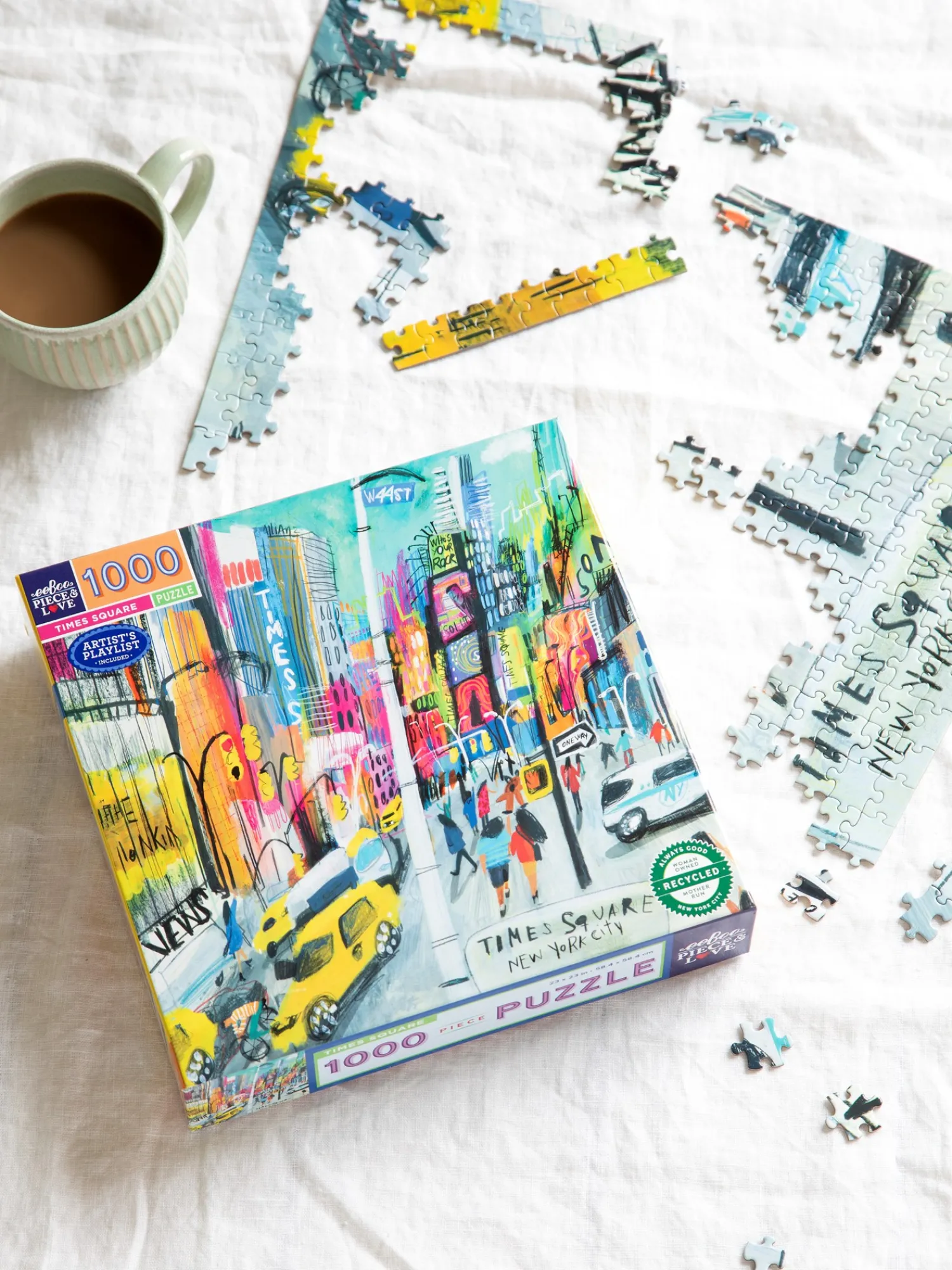 Puslespillet Time Square fra eeBoo er laget av papir, og det er 58,4 x 58,4 cm når det er ferdig. Puslespillet har 1000 brikker. Illustrasjonen er laget av Maru Godas.