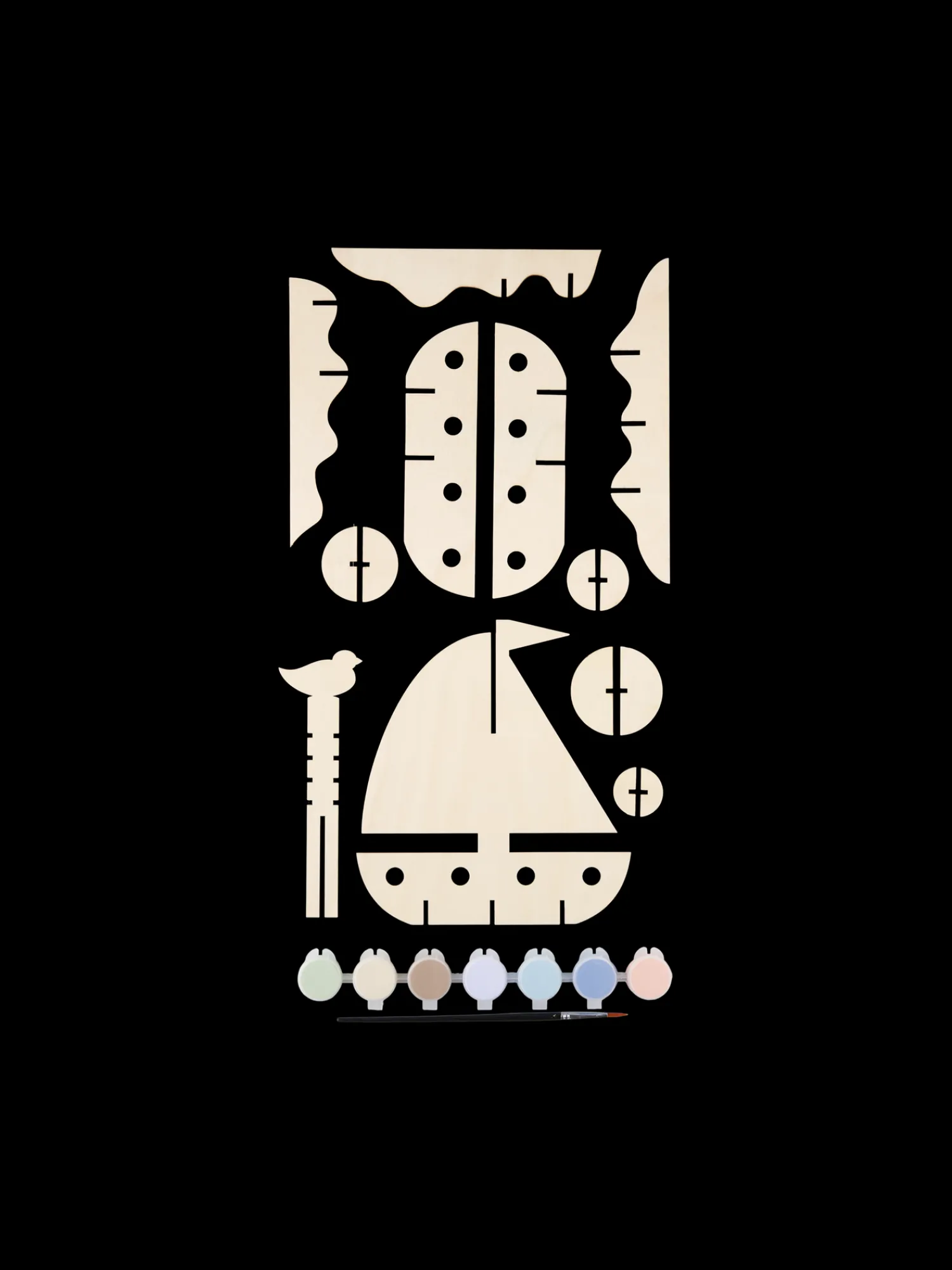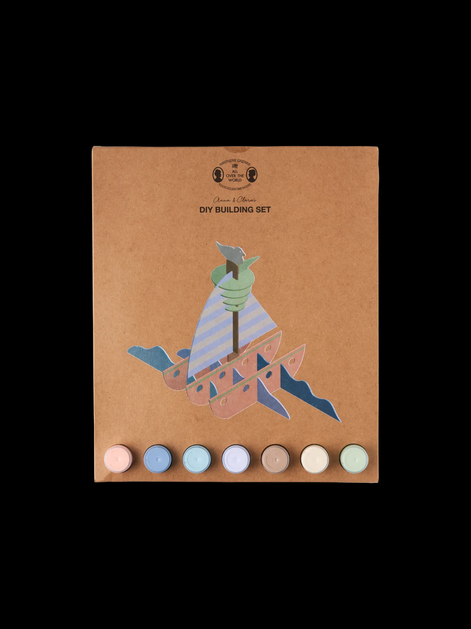 Søstrenes DIY-trebyggesett er 100 % FSC®-sertifisert. Settet består av treplater med utskårne former for å bygge et fint skip, samt en pensel og syv vannbaserte akrylmalinger.