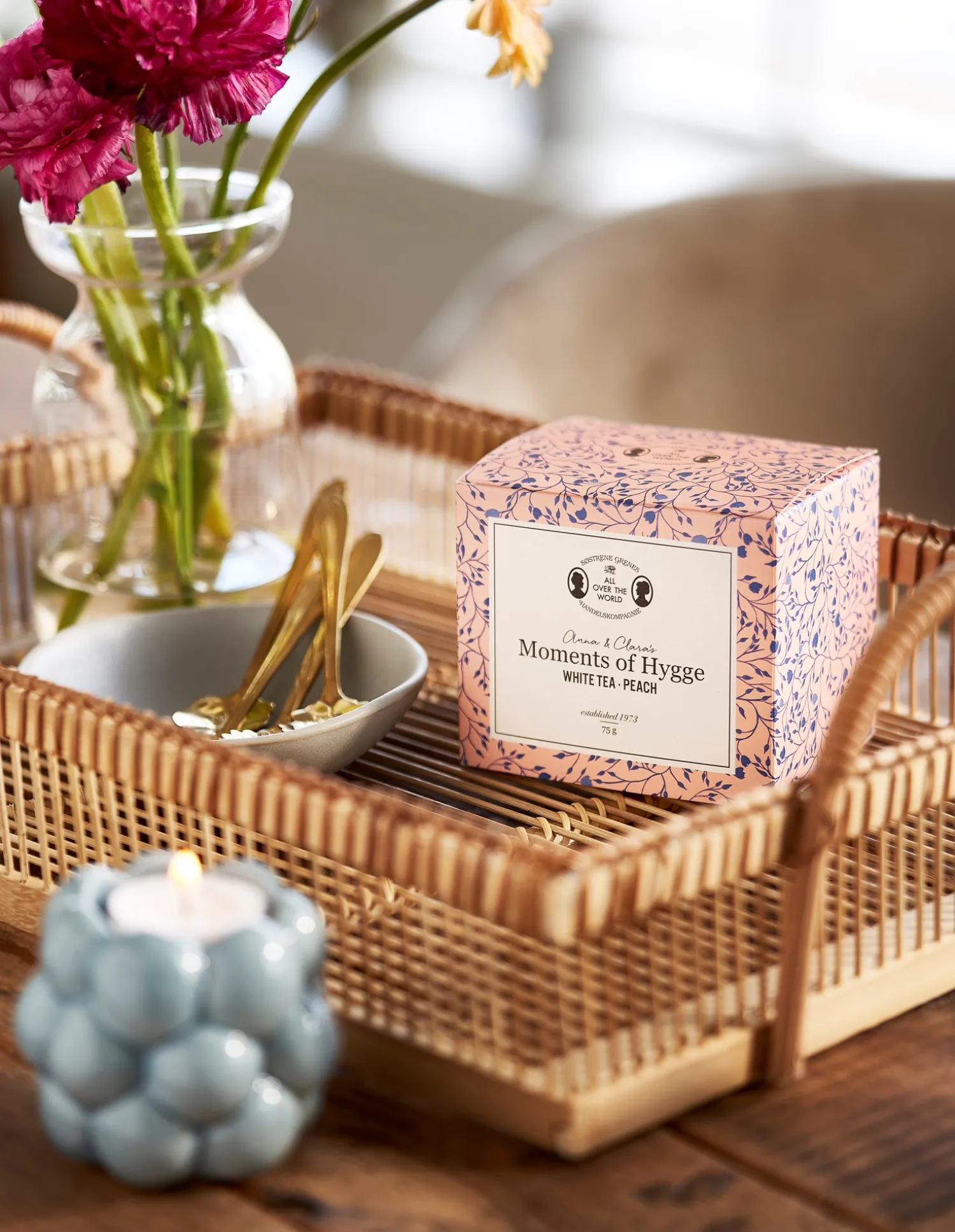 Anna og Claras hvite te Øyeblikk av hygge med ferskensmak er en deilig og forfriskende te som inneholder 95 % hvit te, 2 % fersken og 3 % ferskenaroma. Den leveres i en vakker eske som inneholder 75 g.Denne hvite teen er mild og fruktig, og søstrene anbefaler at De brygger den med nykokt vann på 80 grader. La den trekke i 5–7 minutter, slik at de deilige smakene kan utvikle seg.«En mild og søt hvit te med hint av fersken for en delikat, fruktig følelse», sier Anna og tar en slurk av tekoppen. «Siden hvit te er lettere enn svart te, har den en mer subtil smak som kan nytes når som helst på dagen.»Anna og Claras te kan brygges i enkeltkopper eller hele kanner, samt i tefiltre og teposer. Søstrene minner vennlig på at teen ikke kan returneres eller byttes.