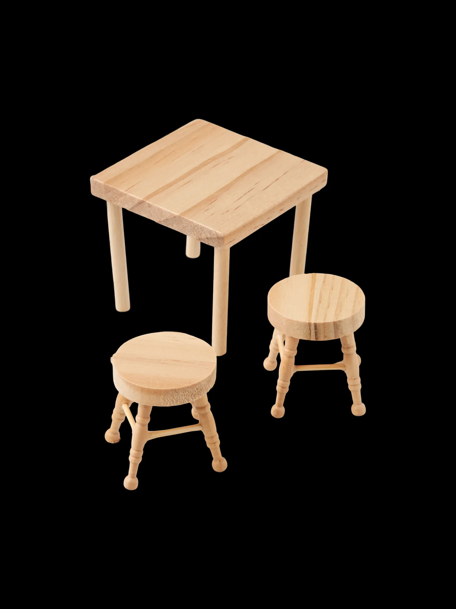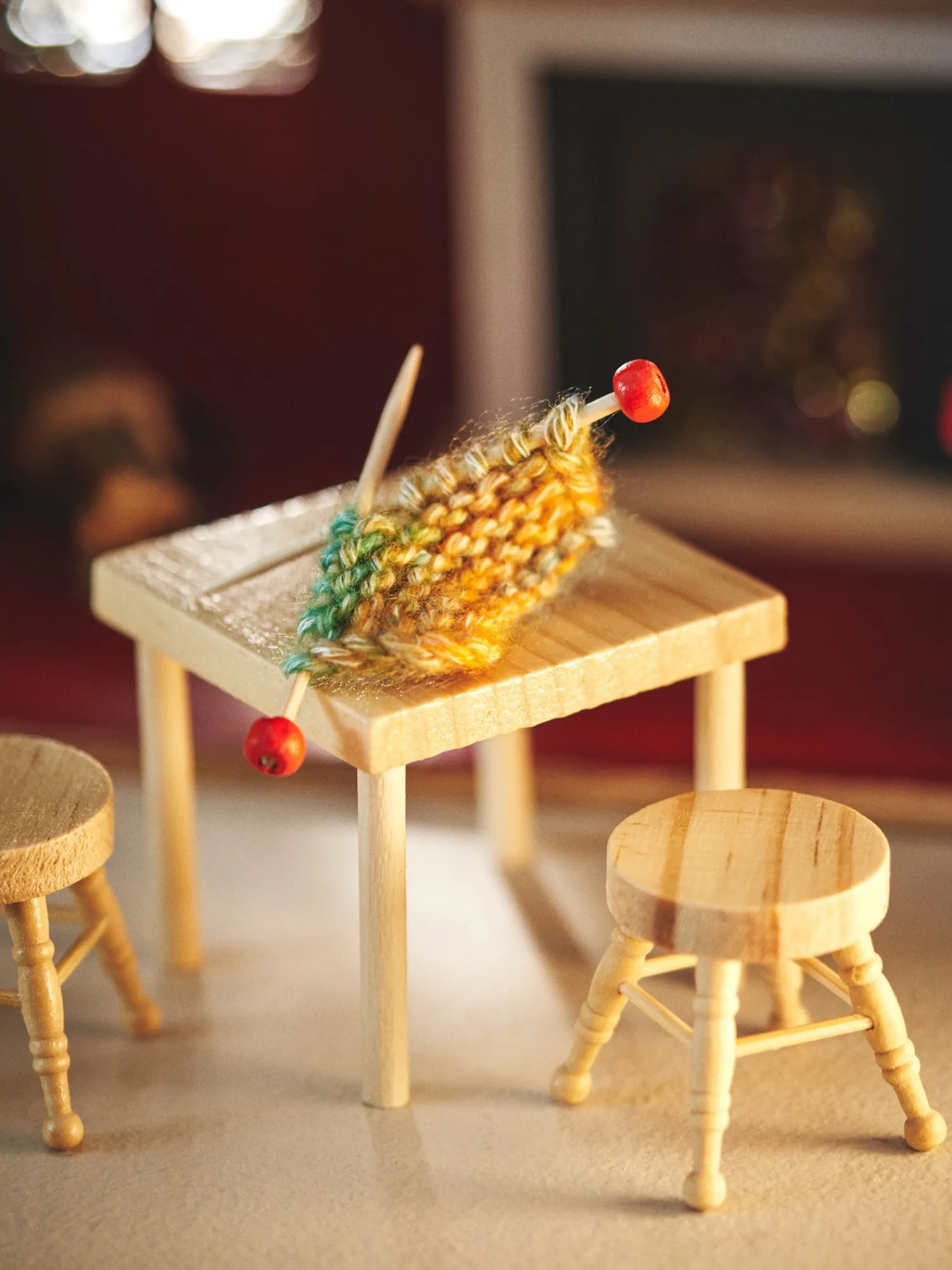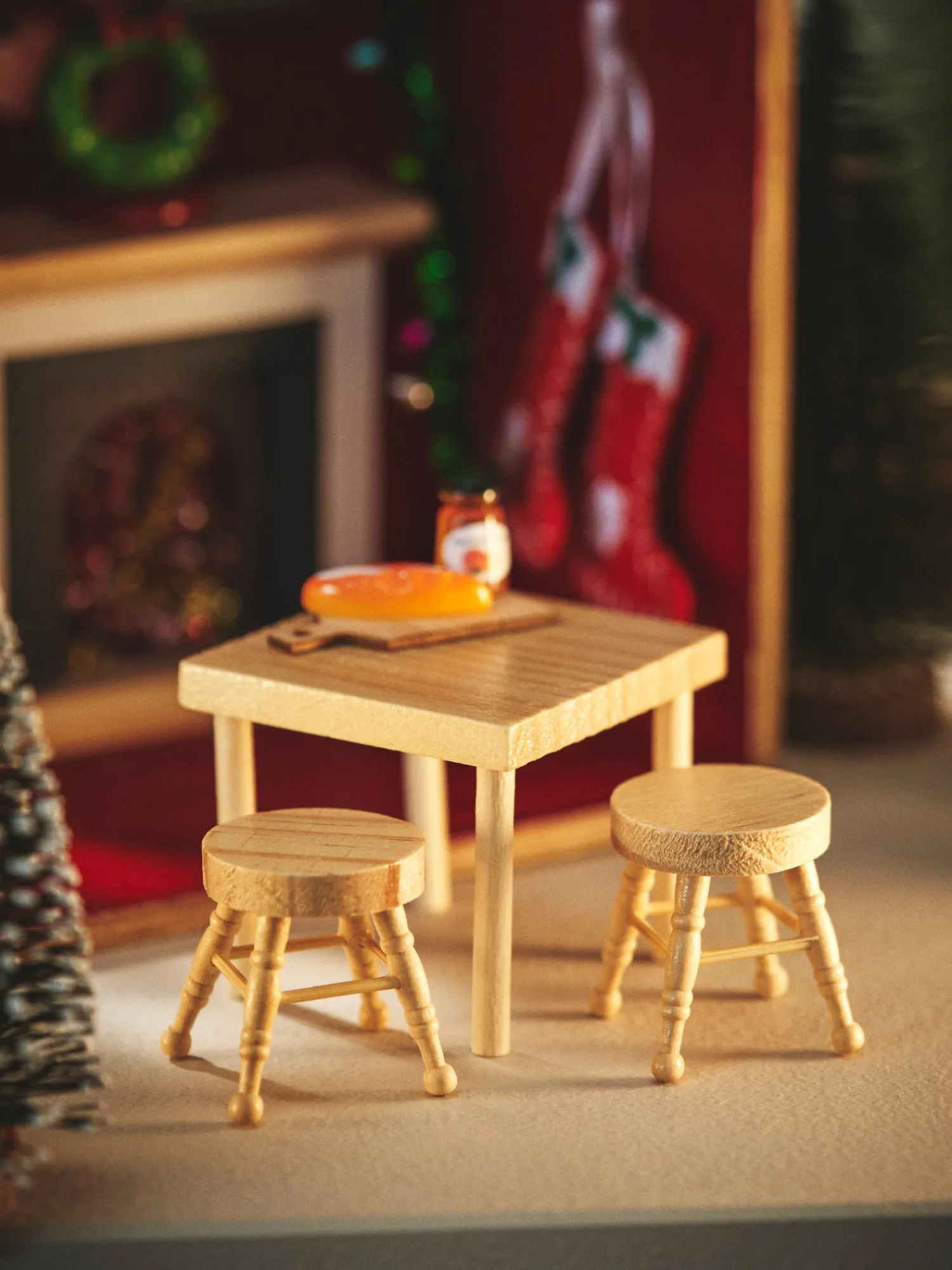 Søstrenes minibord og -stoler er laget av 100 % FSC®-sertifisert furu. Bordet er 5,5 x 5,5 x 4,8 cm, og de to stolene er 3 x 3 x 3 cm.De er et flott tilskudd til den lille julebyen Deres, eller de kan brukes i julealvens hus.