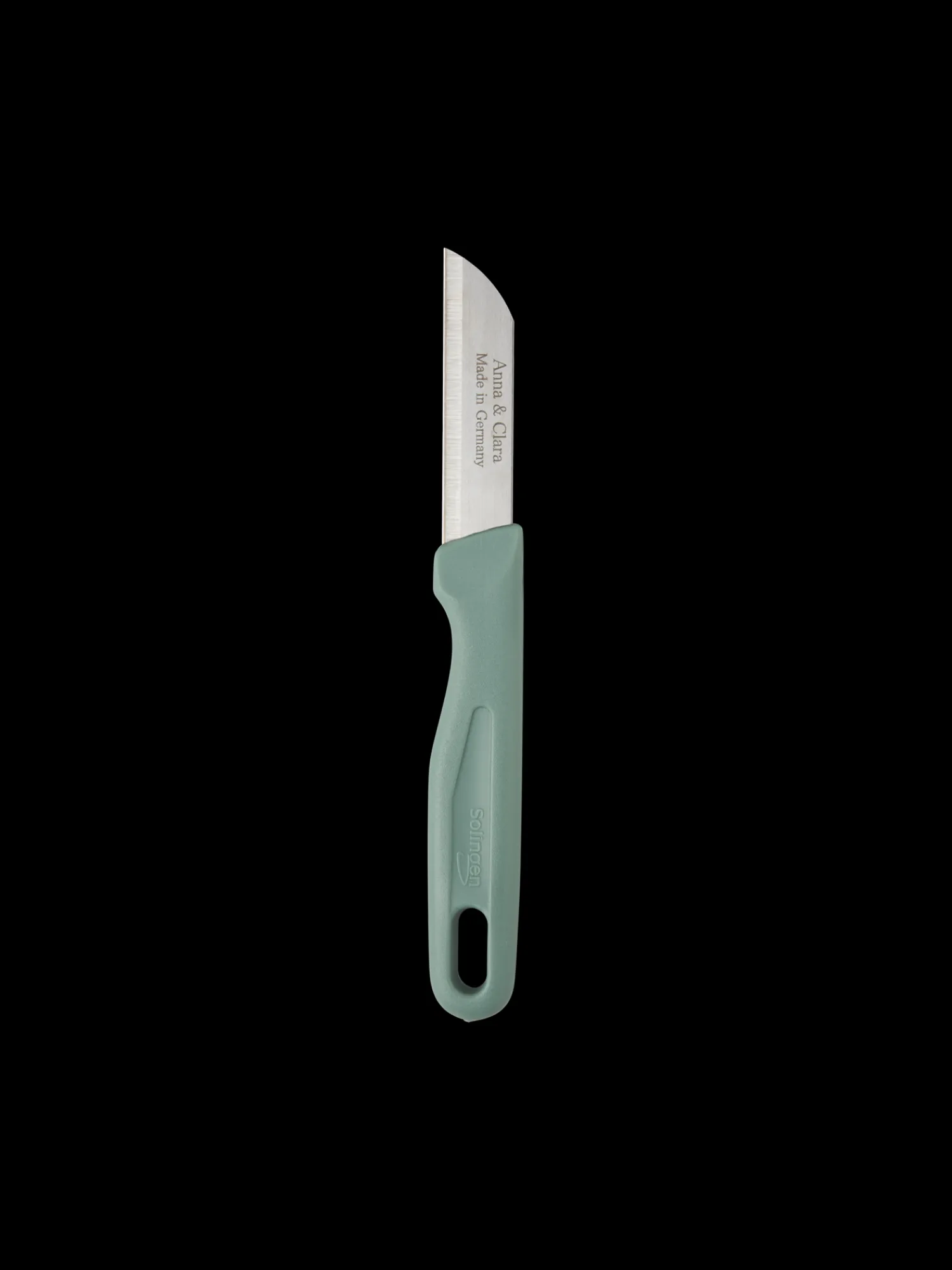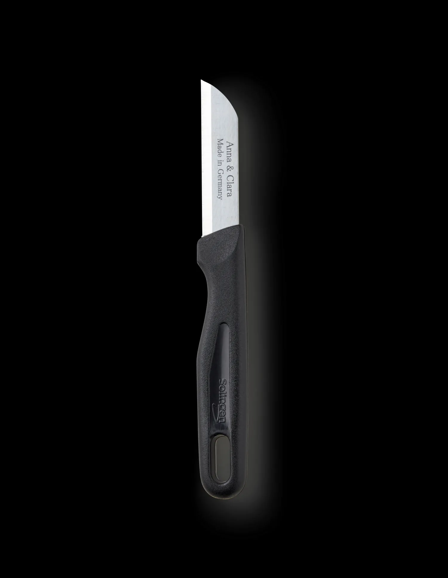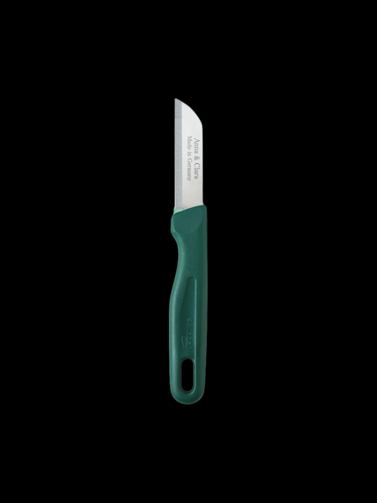 Anna og Claras skallkniv er 16 cm lang og 2 cm bred. Den er laget i Tyskland og består av plast og rustfritt stål.