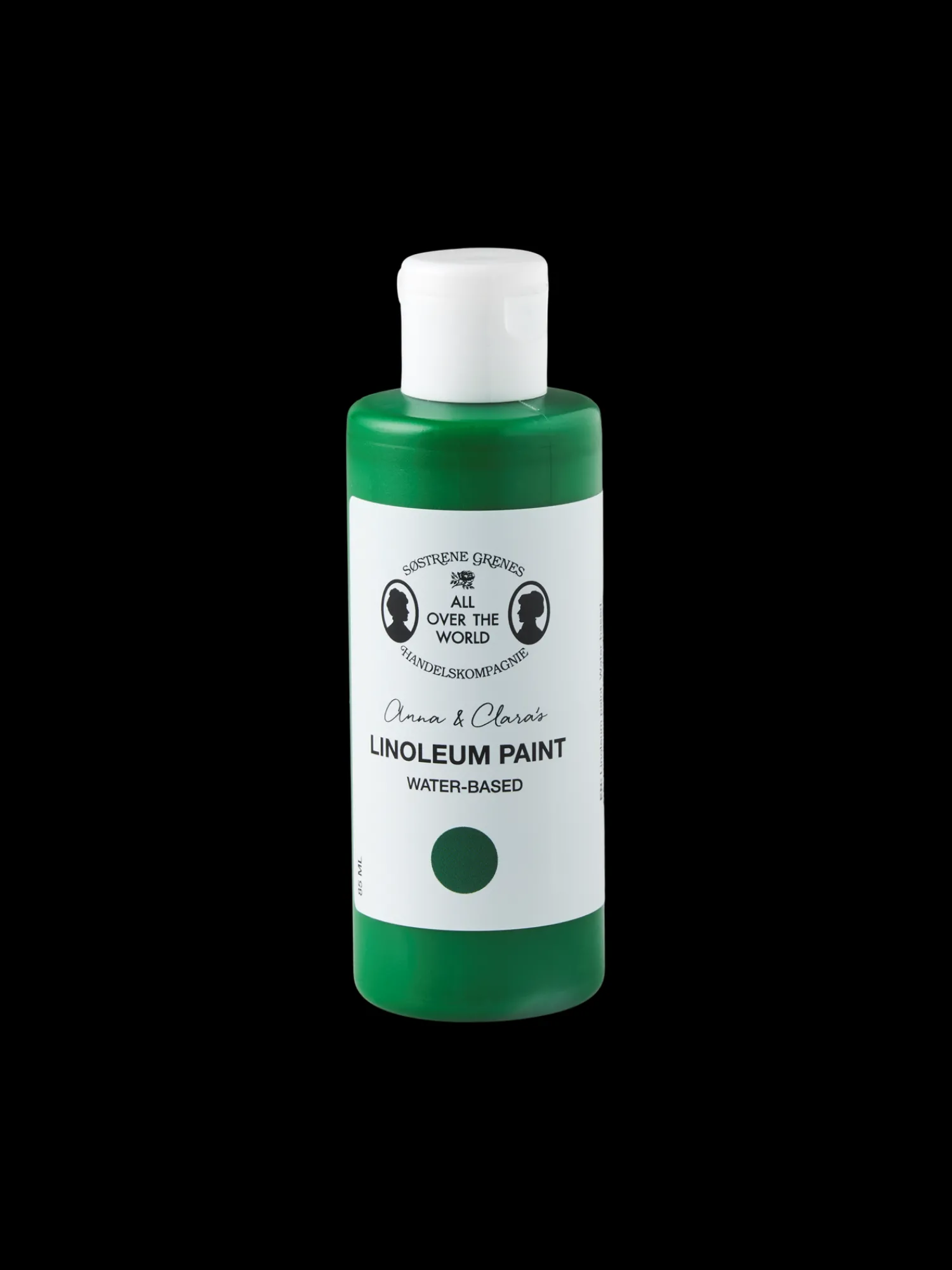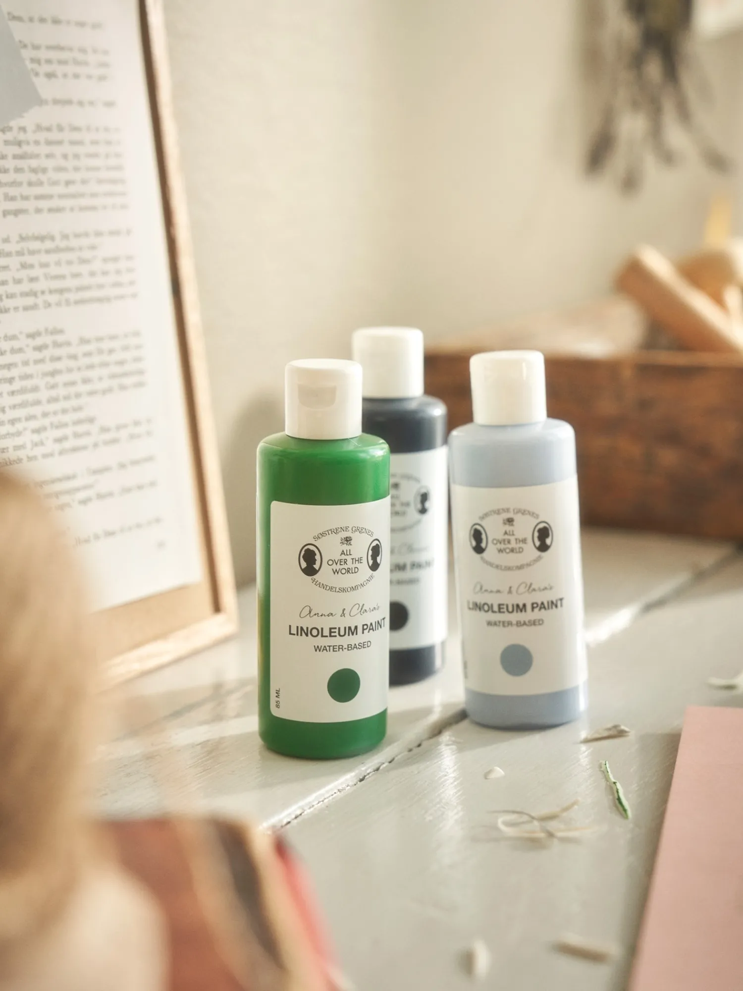 Søstrenes maling for linoleumskunst er vannbasert, og den er produsert i Danmark.