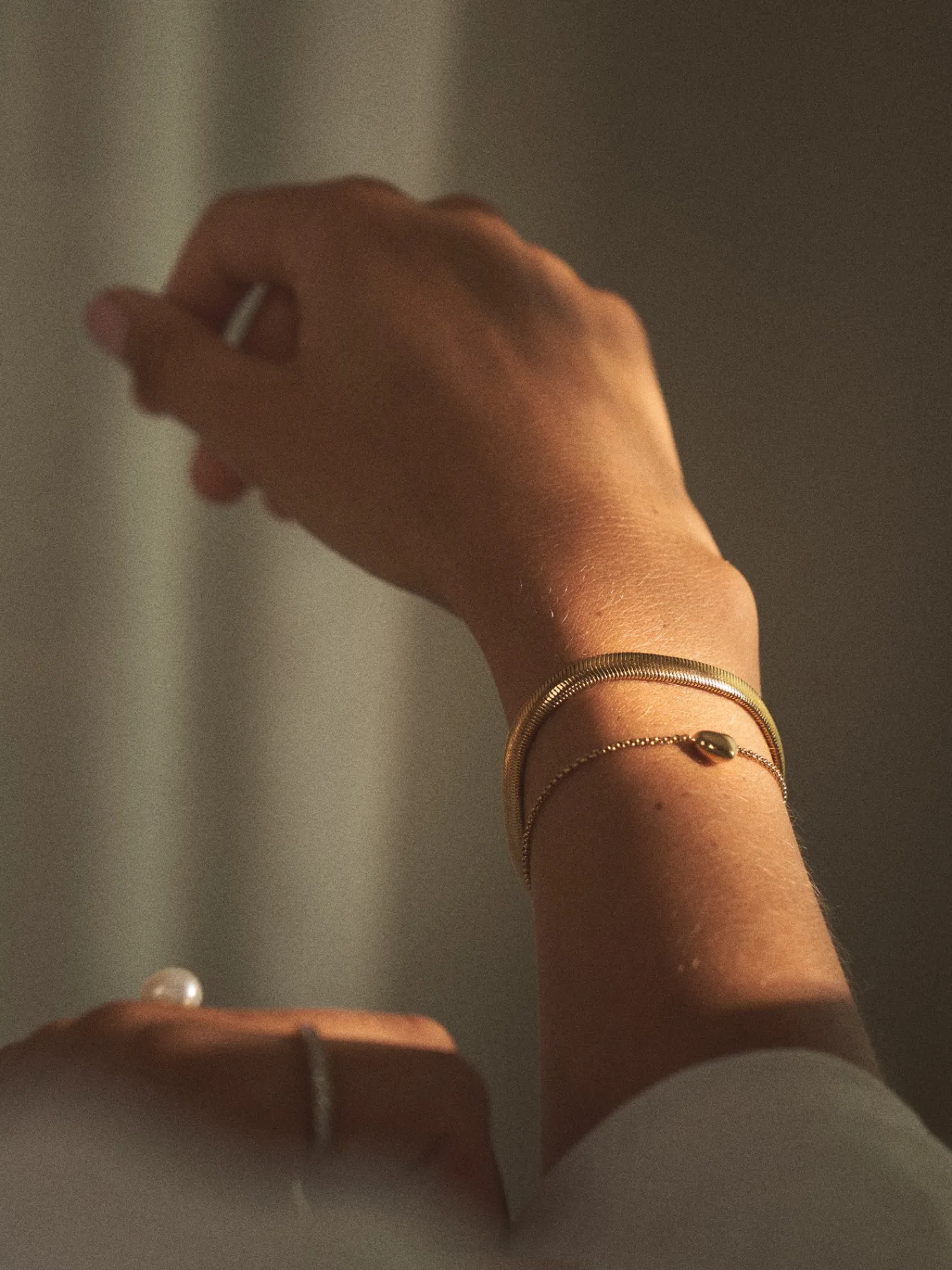 Armbåndet Cabo fra Bud til Rose er et tidløst smykke. Det er laget av rustfritt stål, og det er 16 cm langt med en forlengelse på 3 cm.Søstrene minner vennlig om at De bør unngå direkte kontakt med fuktighet og væsker for å forlenge produktets levetid. I tillegg anbefales det at De tar av dem smykkene Deres før De dusjer, trener eller legger Dem for kvelden, slik at den blanke overflaten bevares.
