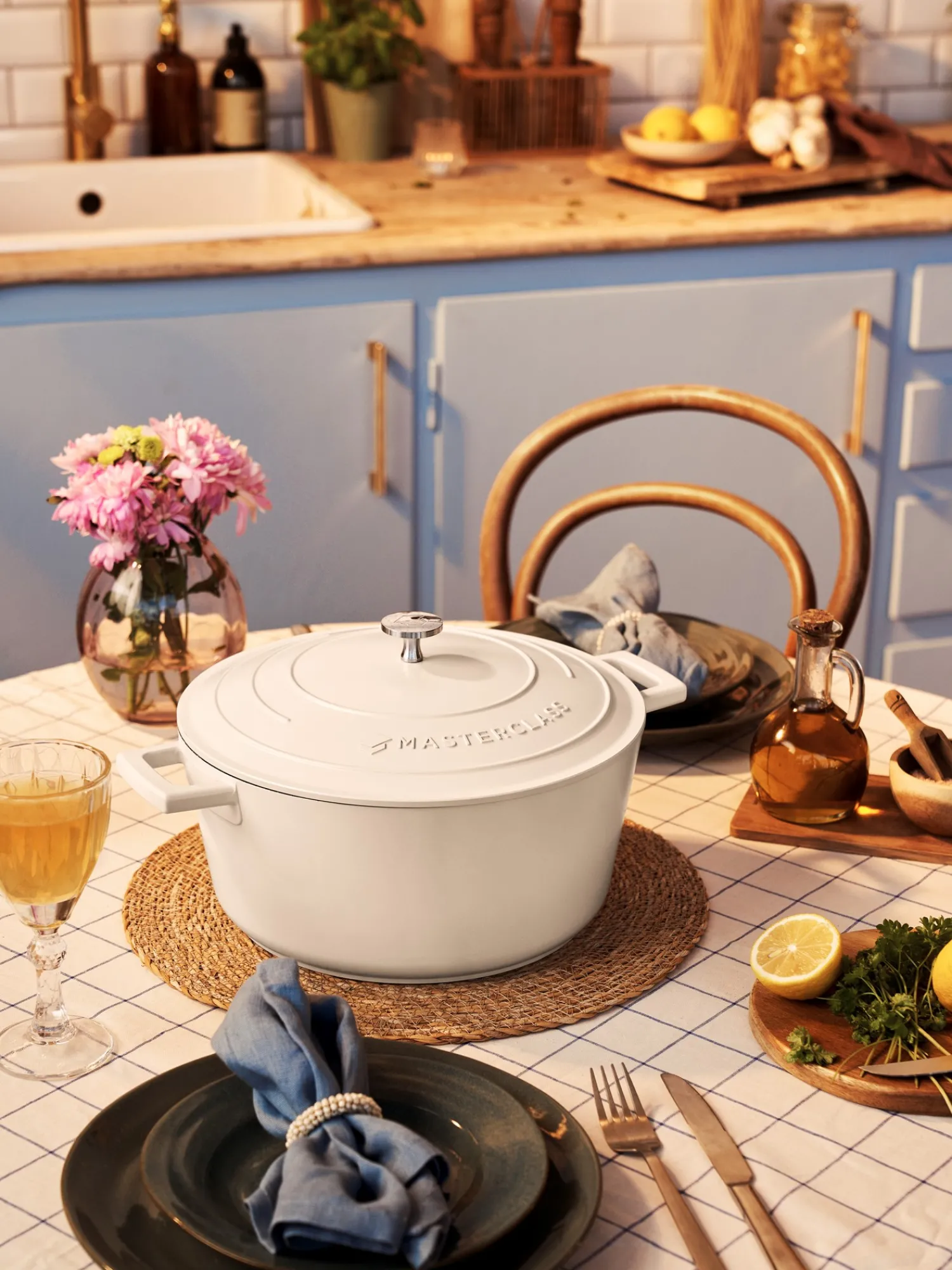 Denne gryten fra MasterClass er laget av aluminiumsstøpegods, som er et lettere materiale enn støpejern, og som gjør at maten kan tilberedes raskt og jevnt. Den rommer 5 liter. Bunnen av rustfritt stål gjør at den kan brukes på enhver platetopp, inkludert induksjon, og den kan også brukes i stekeovn opptil 200 °C. Gryten har en knott og to håndtak samt et selvdryppende lokk som fanger opp dampen og gir en enda bedre matlagingsopplevelse. Den har et solid og slitesterkt ripesikkert lag som fungerer som non-stick, noe som også gjør den enklere å rengjøre. Og sist, men ikke minst kan den vaskes i oppvaskmaskin.