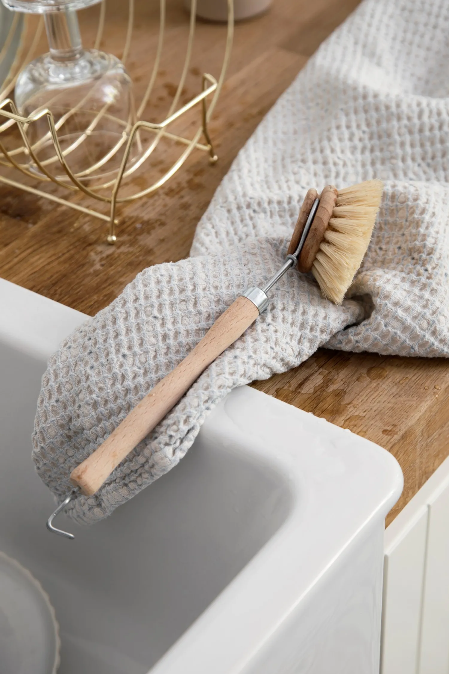 Clara liker å ha det ryddig på kjøkkenet. Hun vasker opp etter en deilig middag, og hun bruker en oppvaskbørste med langt skaft. «Denne oppvaskbørsten av tre er helt fantastisk når De skal vaske opp», sier Clara. Søstrenes oppvaskbørste er laget av bøk og naturlige fibre. Børstehodet kan tas av, slik at det er enkelt å bytte når De trenger det. «Et praktisk og nyttig verktøy på kjøkkenet», sier Clara med et smil.
