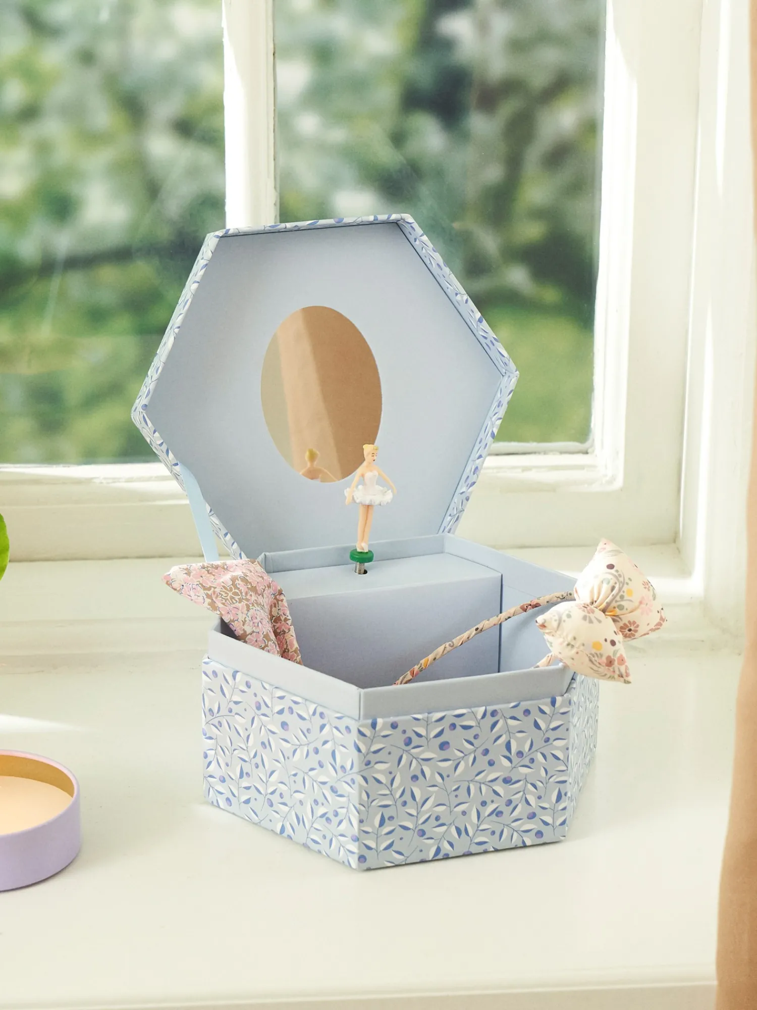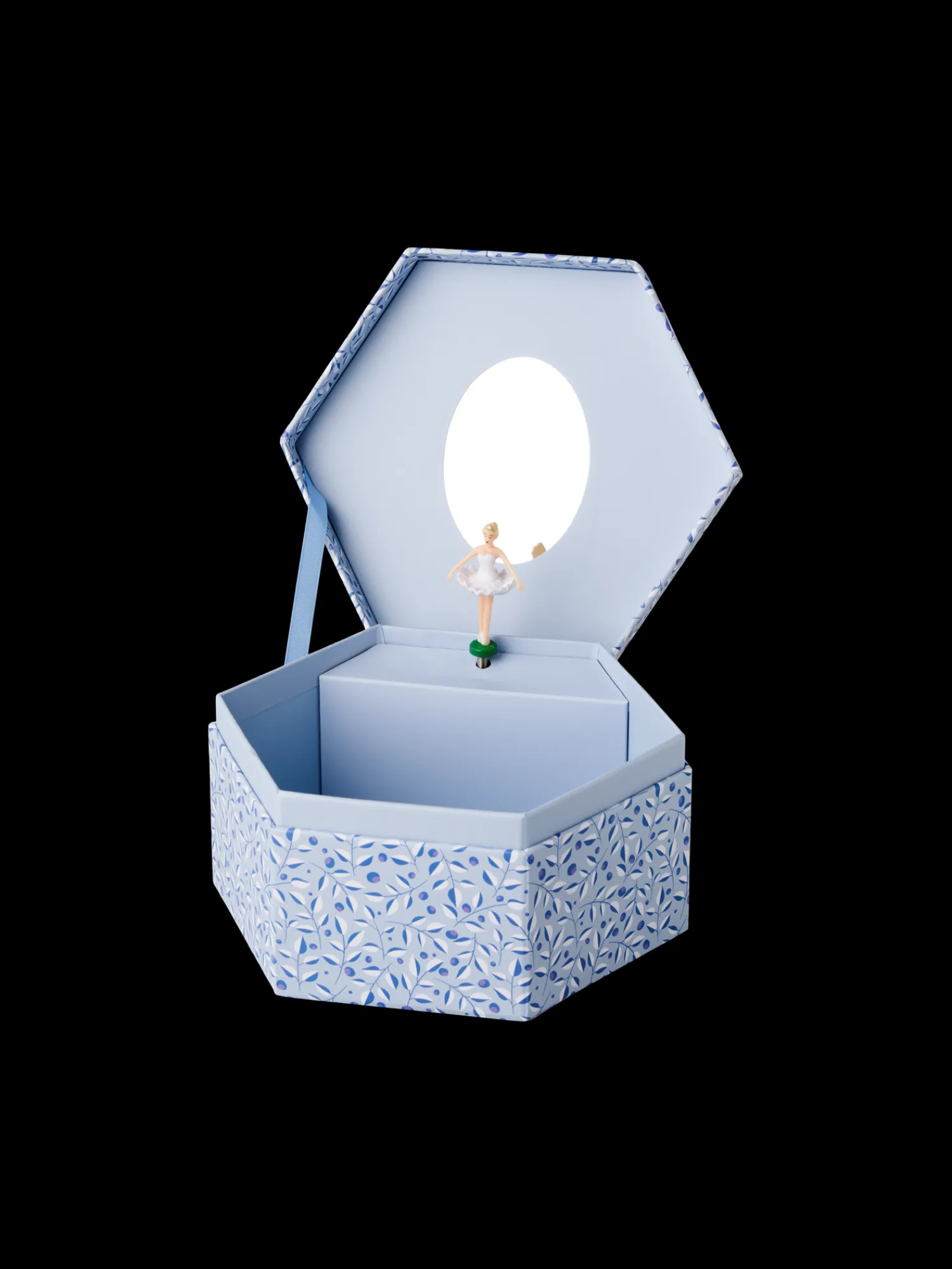 Søstrenes musikalske smykkeskrin er laget av FSC®-sertifisert papir samt glass, polypropylen og polyester.Når smykkeskrinet åpnes, snurrer den lille ballettdanseren forsiktig til musikken som spilles.