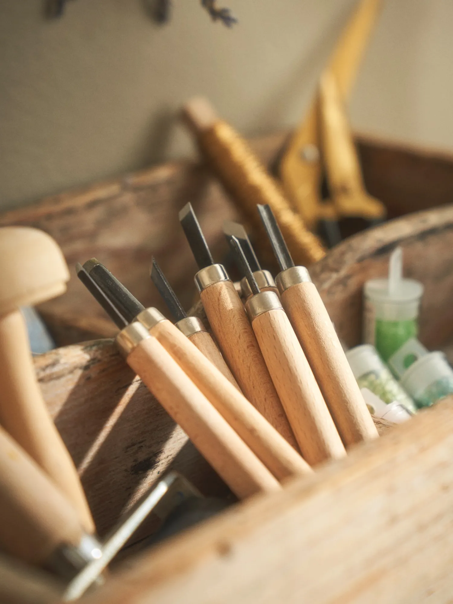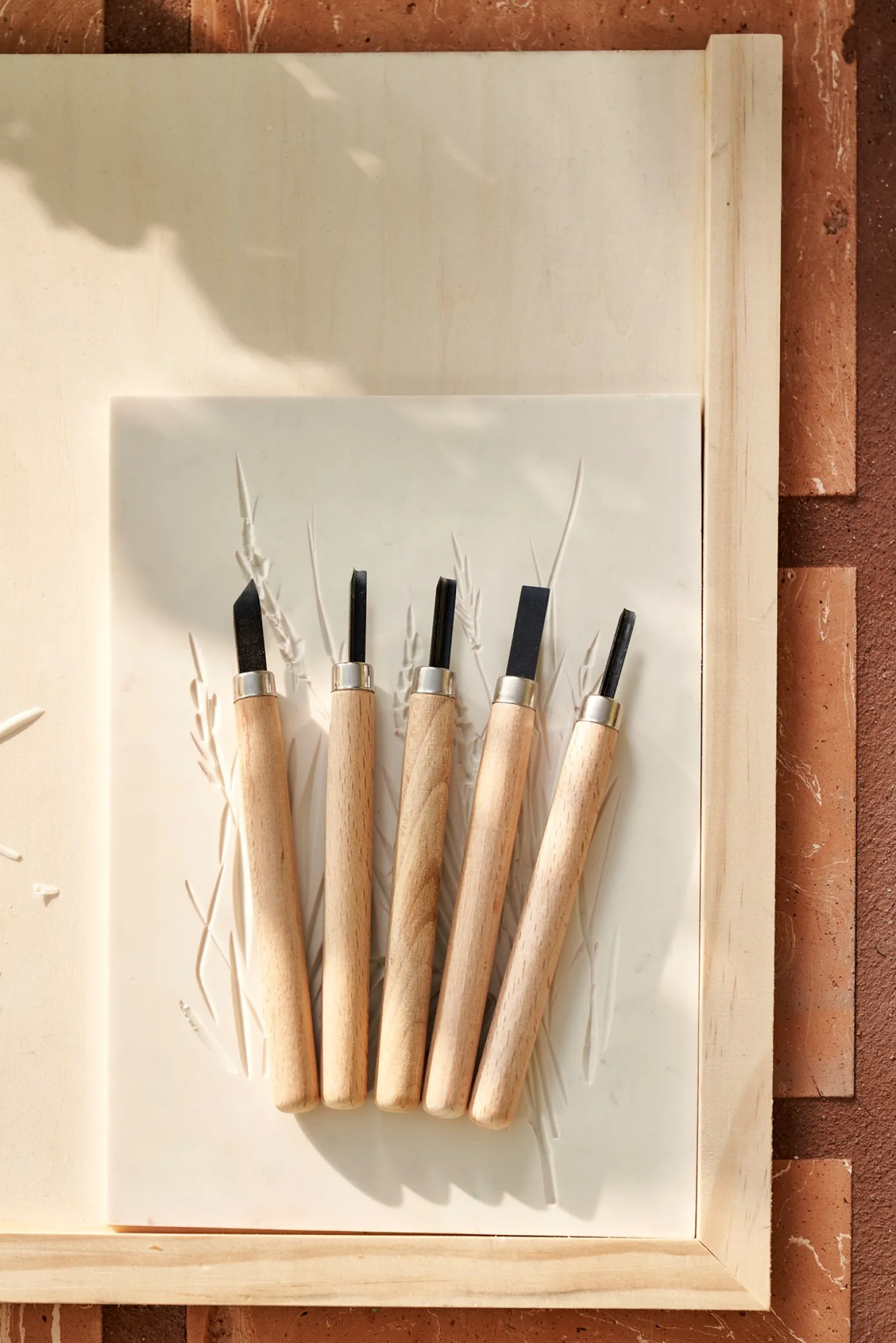 Søstrenes utskjæringssett for linoleumskunst er laget av jern og bøk, og hver del er 13 x 1 cm. Det består av fem verktøy for å lage linoleumskunst.«Linocut, som også kalles linotrykking eller linoleumskunst, er en form for trykking der De skjærer et mønster eller motiv i en overflate av linoleum eller gummi, slik at De kan trykke det», forklarer Anna vennlig. «Det er en vidunderlig kreativ syssel, og med disse verktøyene for linoleumskunst kan De skjære motivet Deres inn i linoleumsarket.»