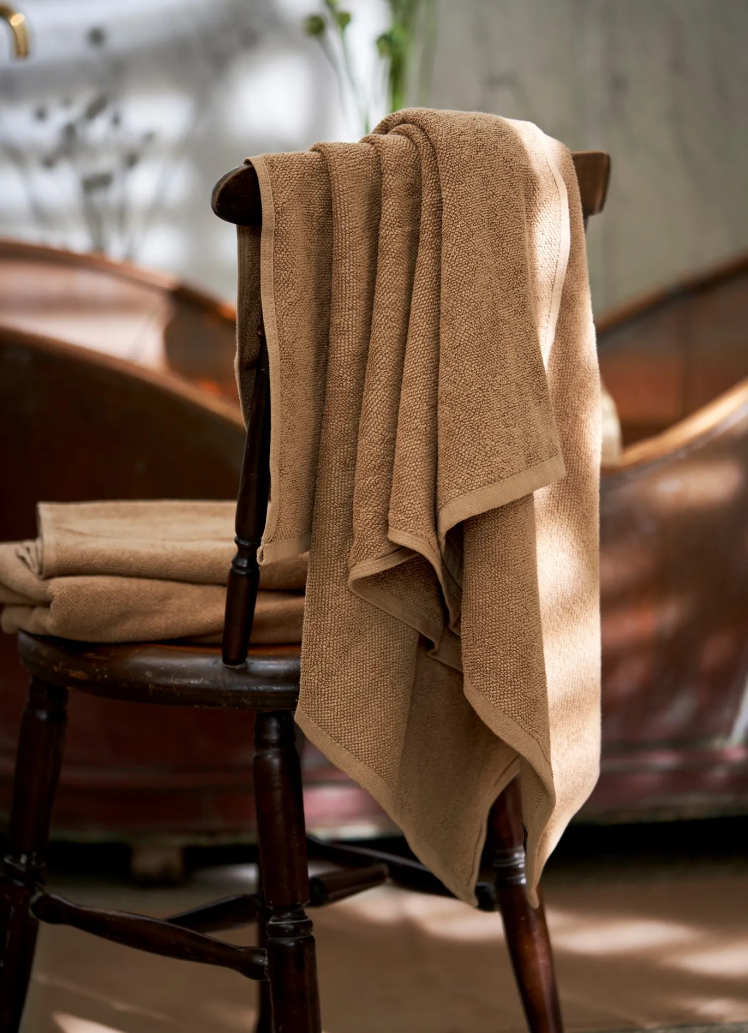 Søstrenes håndkle er laget av bomull, og det er 140 x 70 cm. Clara pynter baderommet med et duftlys, en vakker plante – og nye, myke håndklær. «Myke materialer skaper en følelse av luksus i hverdagen», sier hun.