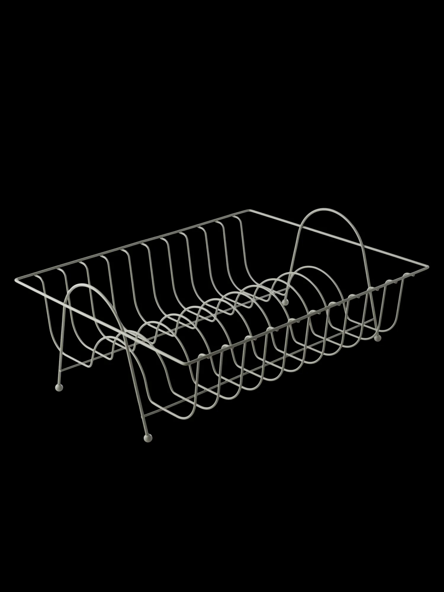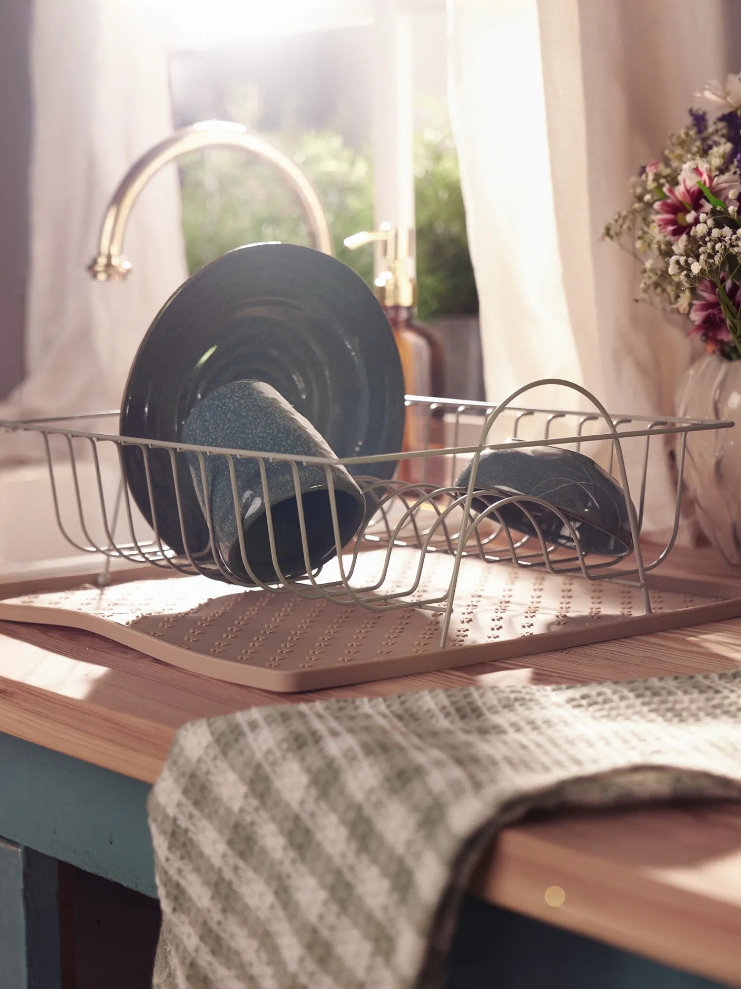 Søstrenes oppvaskstativ er laget av jern, og det er 34,1 x 27,4 x 8,4 cm.