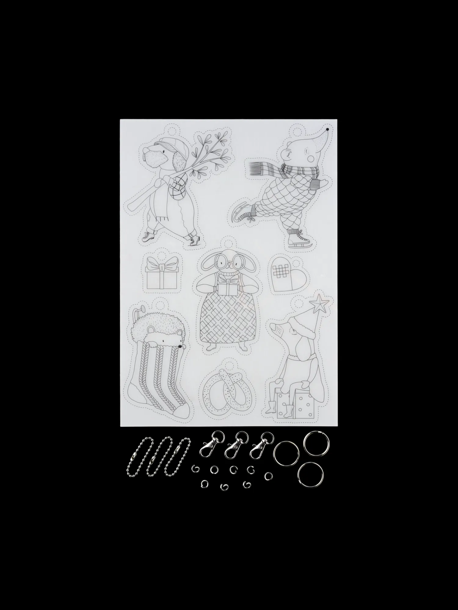 Søstrenes DIY-sett for krympekunst inneholder et A4-ark med forskjellige motiver som kan fargelegges eller males, tre kjedelåser, tre kroklåser og tre metallringer.
