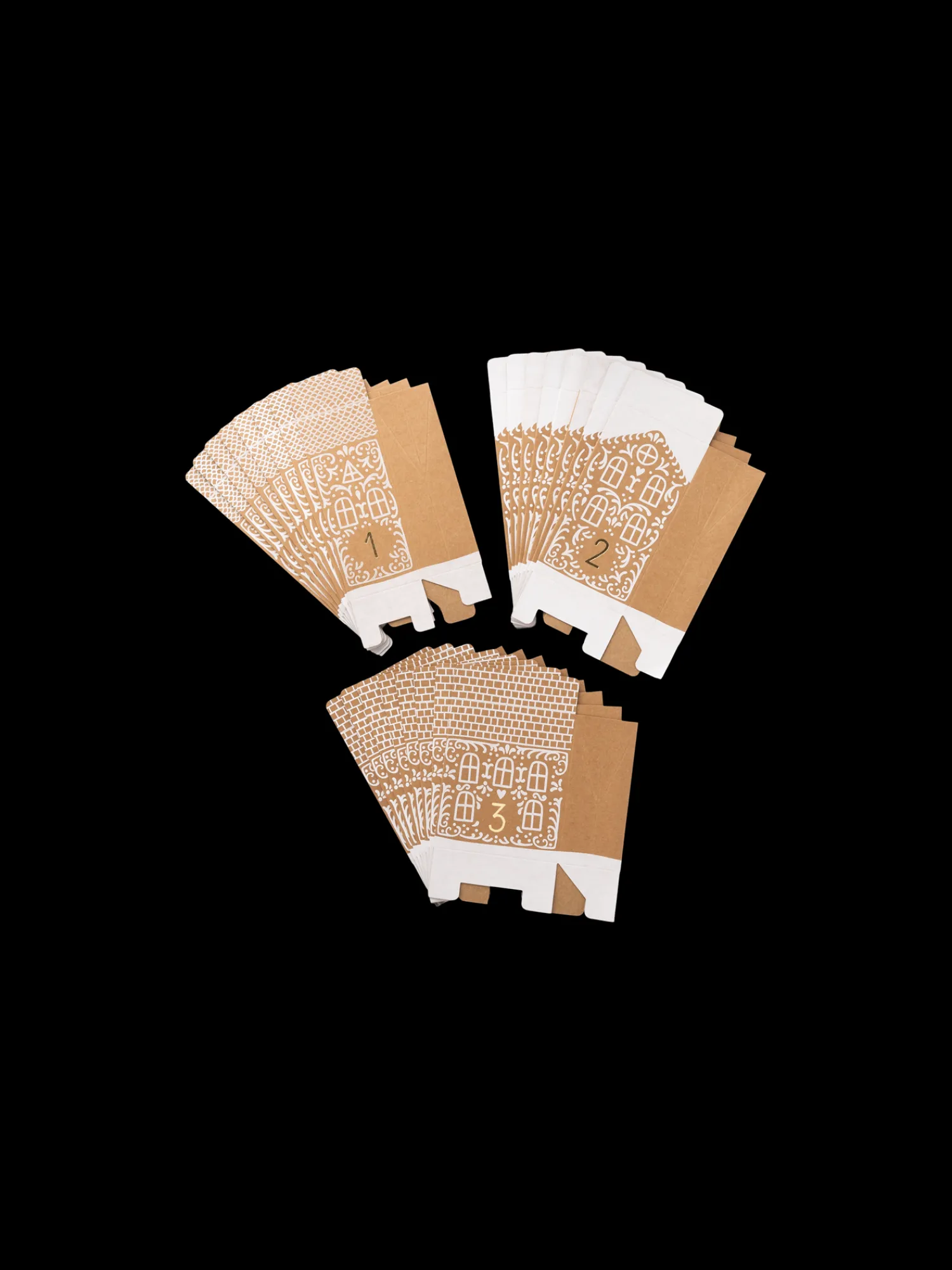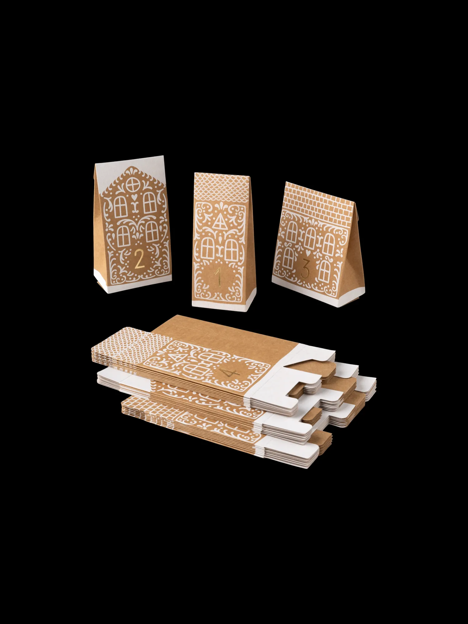 Søstrenes nummererte gaveposer er laget av FSC®-sertifisert papir. Det er 24 poser totalt, med åtte poser på 10 x 12 cm, åtte poser på 8 x 15 cm og åtte poser på 6 x 15 cm. Bruk disse søte små posene til adventsgaver.