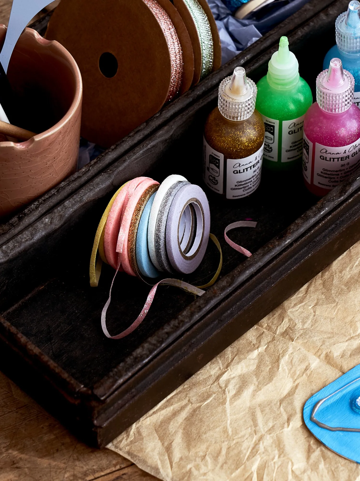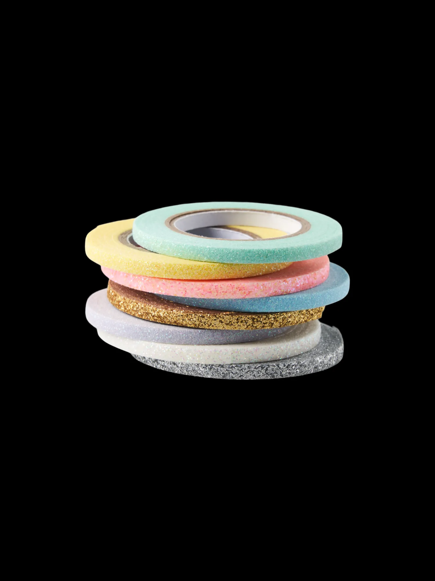 Søstrenes dekorative tape er laget av papir og polypropylen. Pakken inneholder åtte ruller på 3 mm x 3,66 m i glitterfarger.