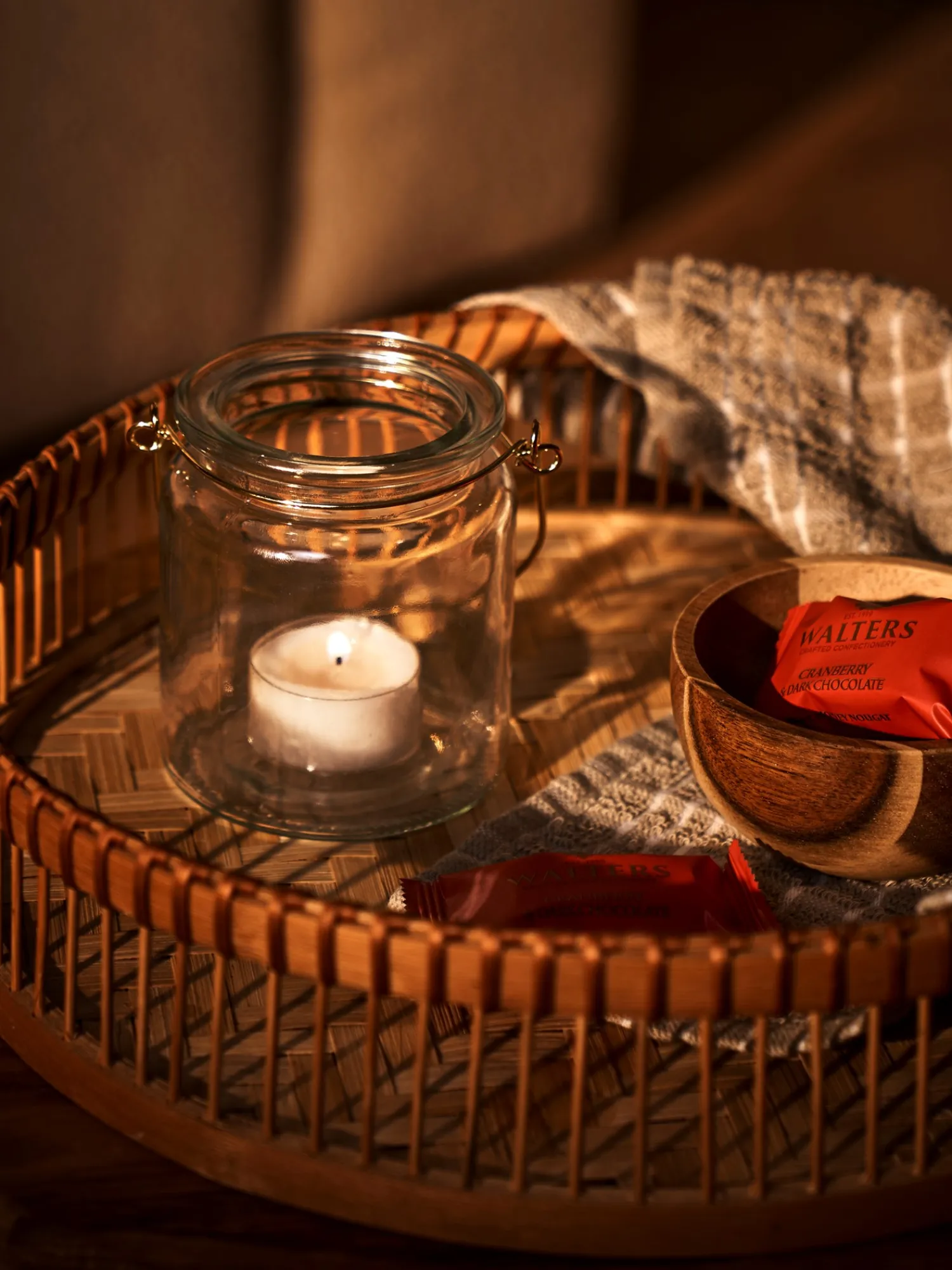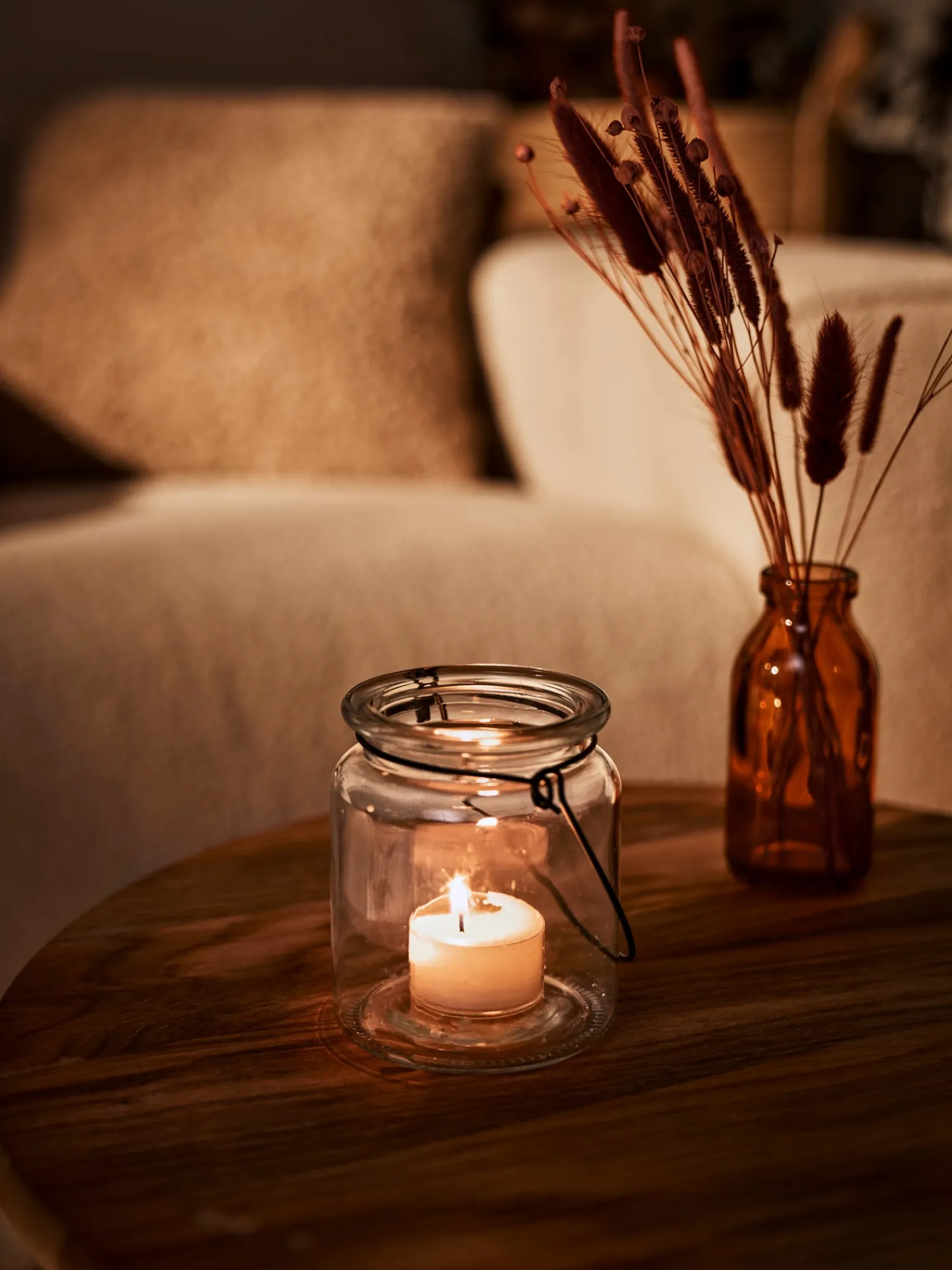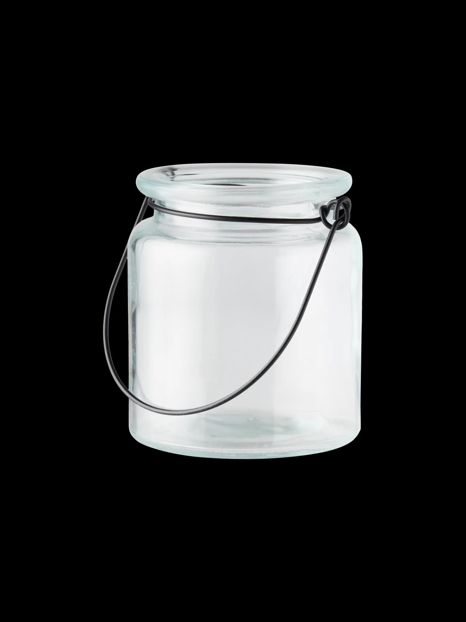 Søstrenes telysholder er laget av glass, og den har et lite håndtak av metall.