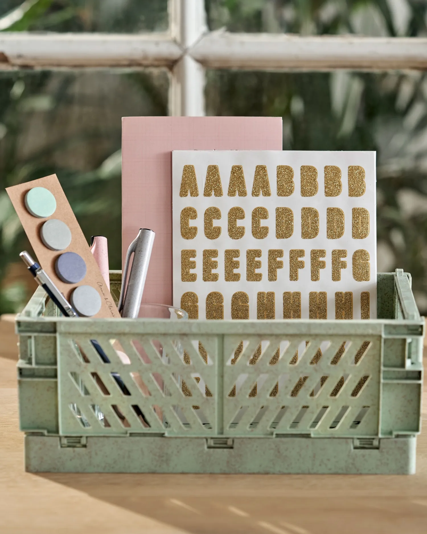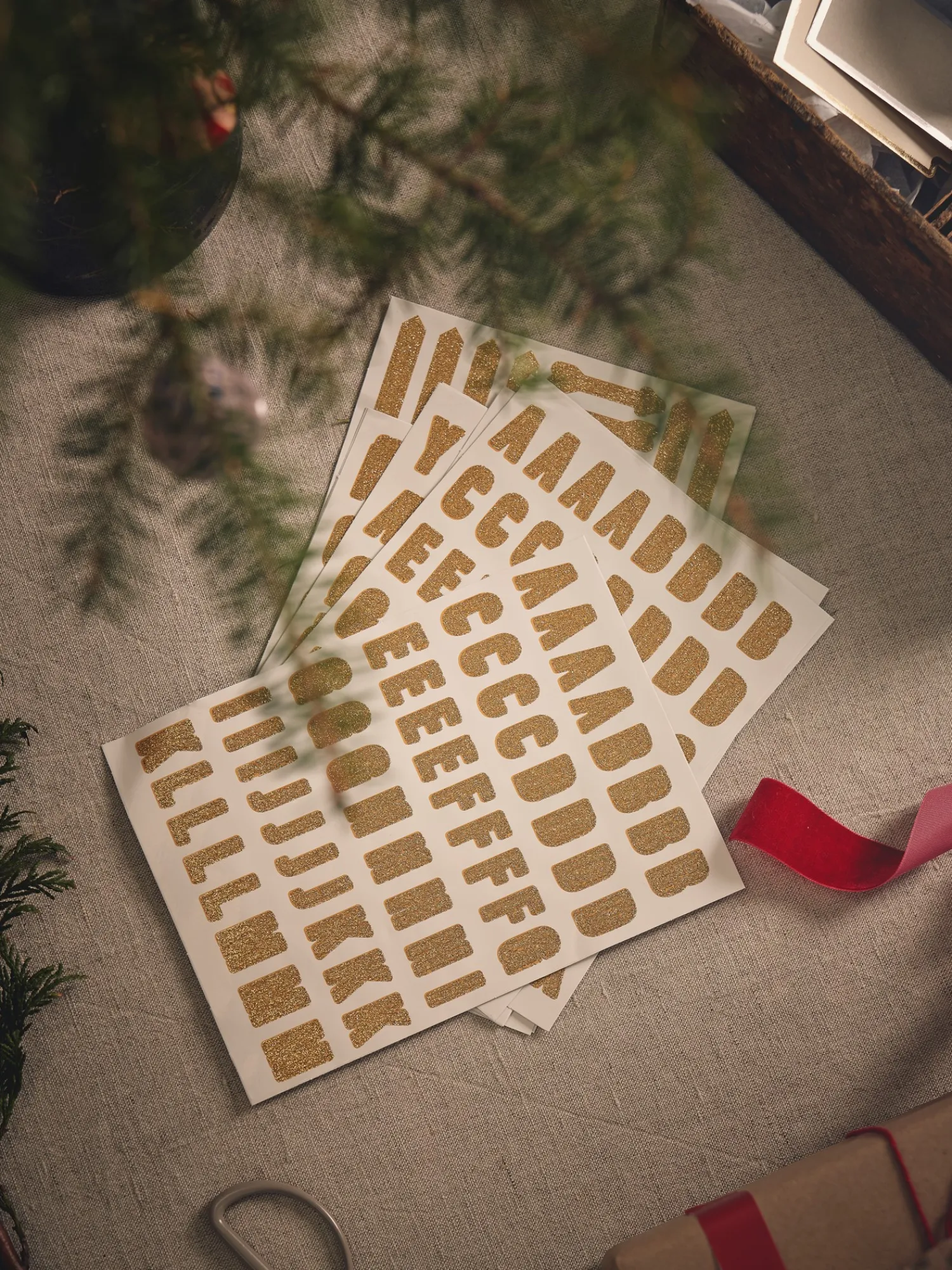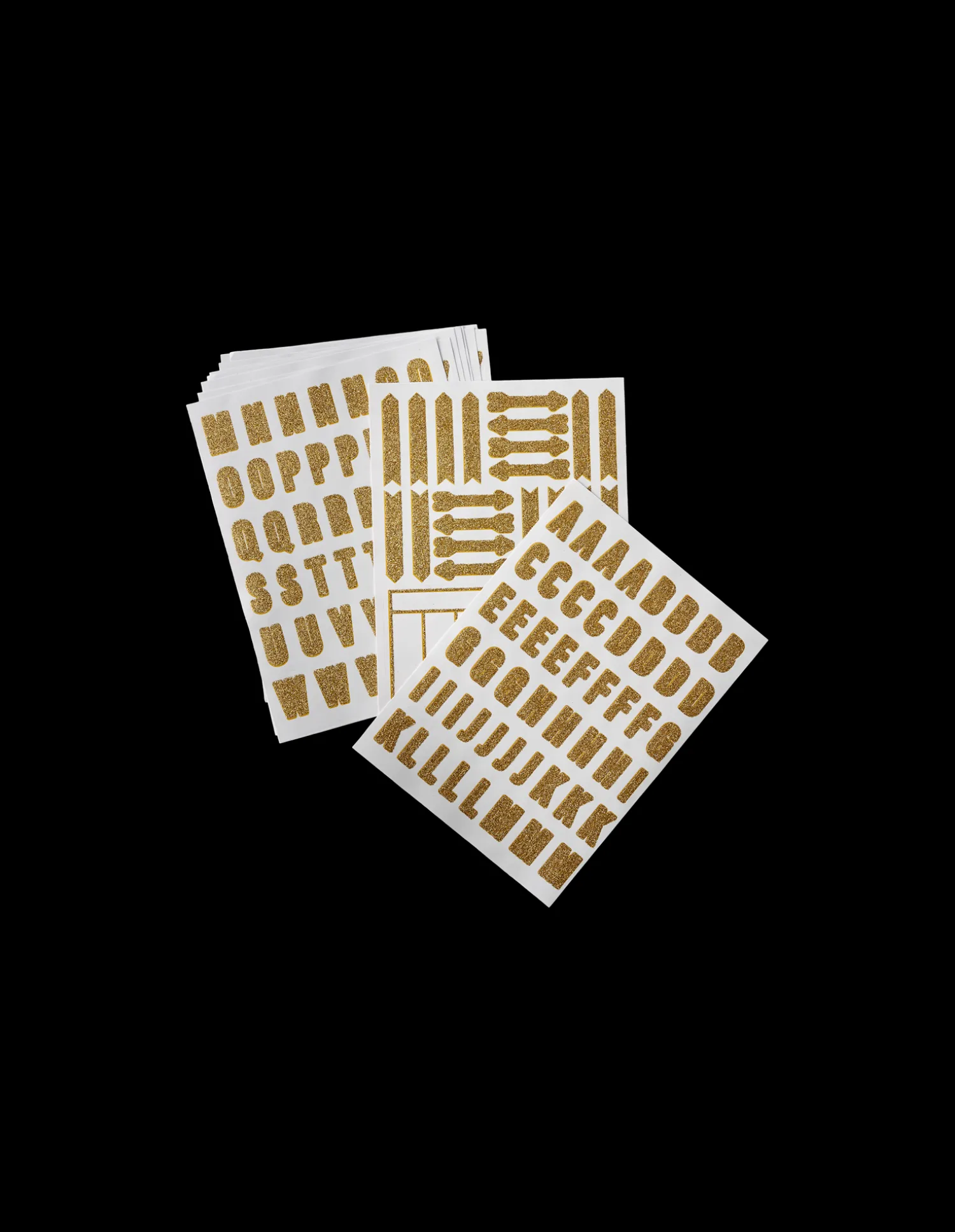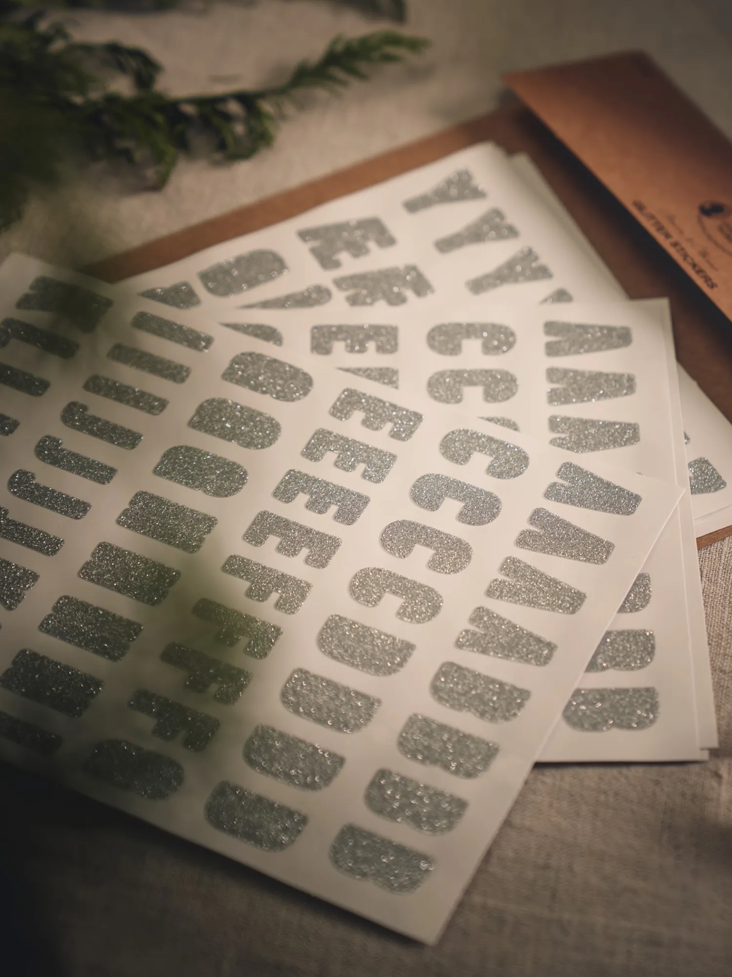 Søstrenes glitterklistremerker er FSC®-sertifisert, og det er rundt 400 klistremerker på ti ark, med bokstaver fra A til Z og noen spesialbokstaver, tall fra 0 til 9 samt en rekke piler og bokser. Klistremerkene med tall og bokstaver er cirka 1 x 2 cm.