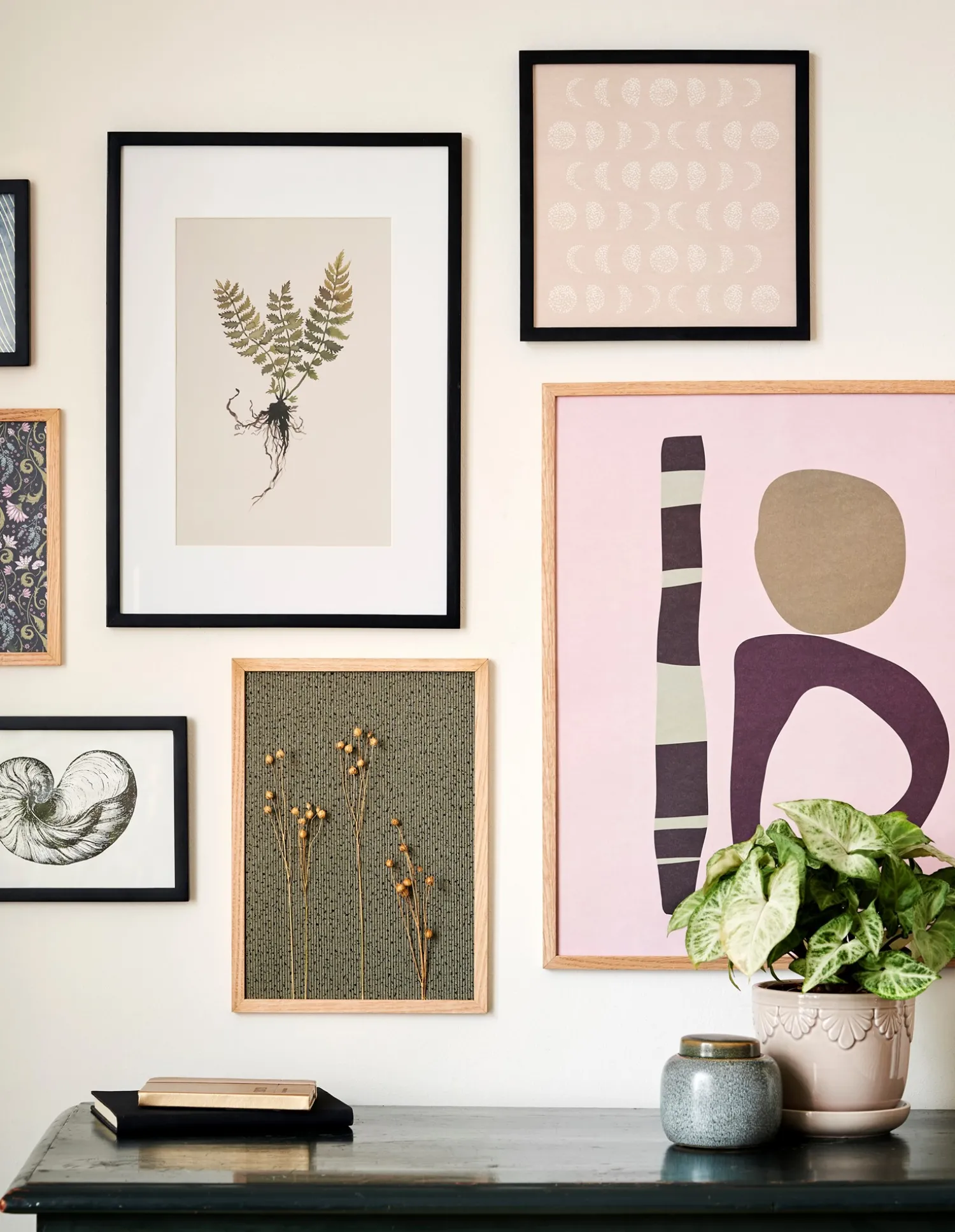 For Anna er veggene i hjemmet som store lerreter som venter på at hun skal slippe kreativiteten løs. Hun er ikke glad i tomme vegger. Derfor sørger hun for at det henger kunst på alle vegger i alle rom. «Veggkunst er viktig for å gi rommet atmosfære», sier hun med et smil. Søstrene liker å bruke vakre rammer når de skal pynte veggene. De kan bruke rammen til fine bilder, hjemmelagde kunstverk eller pressede blader og blomster. «Og så må De bare finne ut hvor De skal henge den», sier Anna. Rammen er laget av glass og FSC®-sertifisert furu. De utvendige målene er 16,2 x 22,5 cm, og de innvendige målene er 14,8 x 21 cm. Dessverre kan ikke søstrene garantere at De får det samme motivet i rammen som vises på dette bildet.