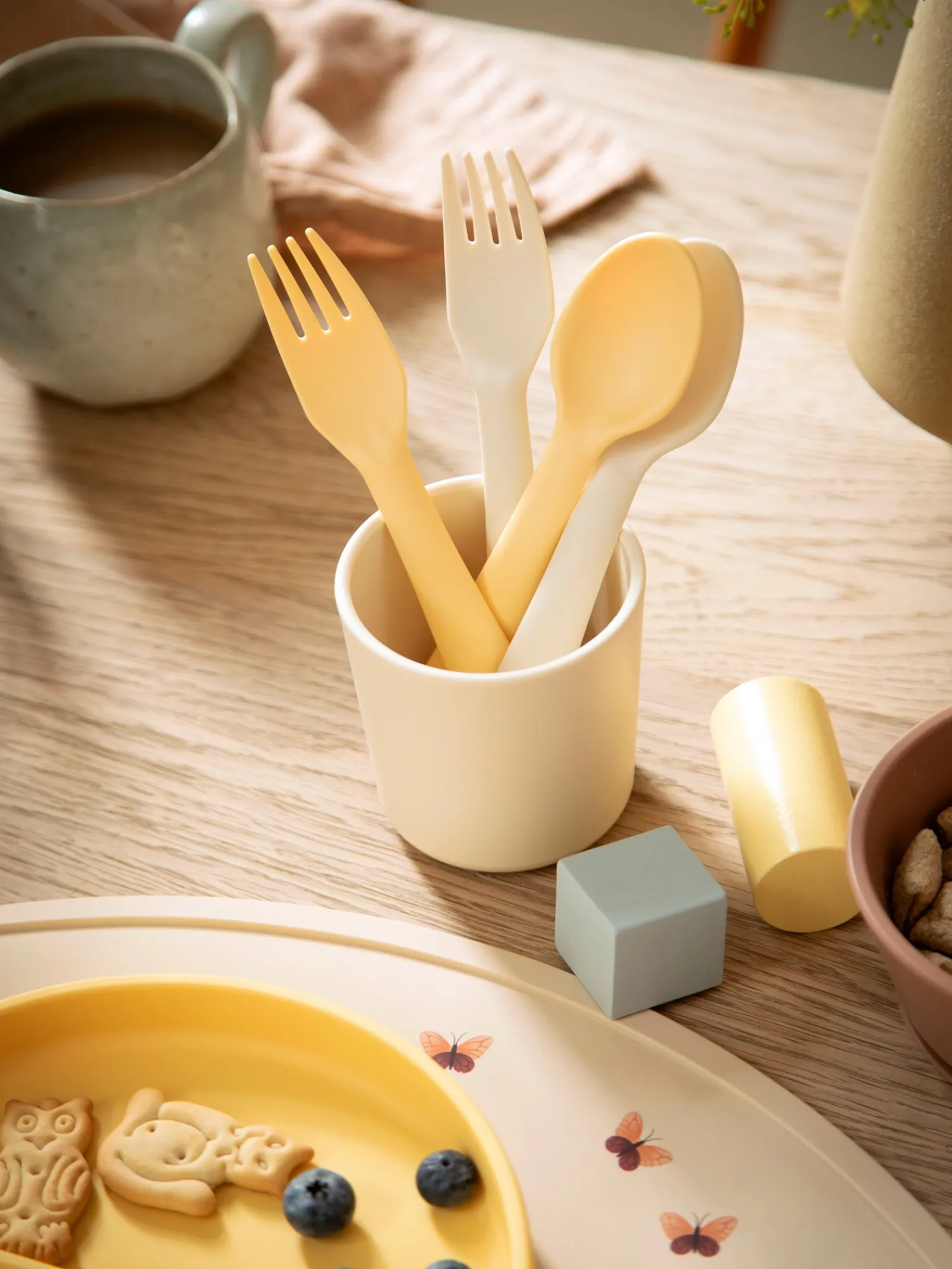 Settet med skje og gaffel fra Mushie er enkelt, men elegant. Det er lett for barnet å holde. Dette settet er laget i Danmark, og det tåler oppvaskmaskin, slik at rengjøringen blir litt enklere. Produktet skal alltid brukes under tilsyn av voksne. Kontroller produktet før bruk. Hvis det har tegn på skader eller svekkelser, må det kasseres.