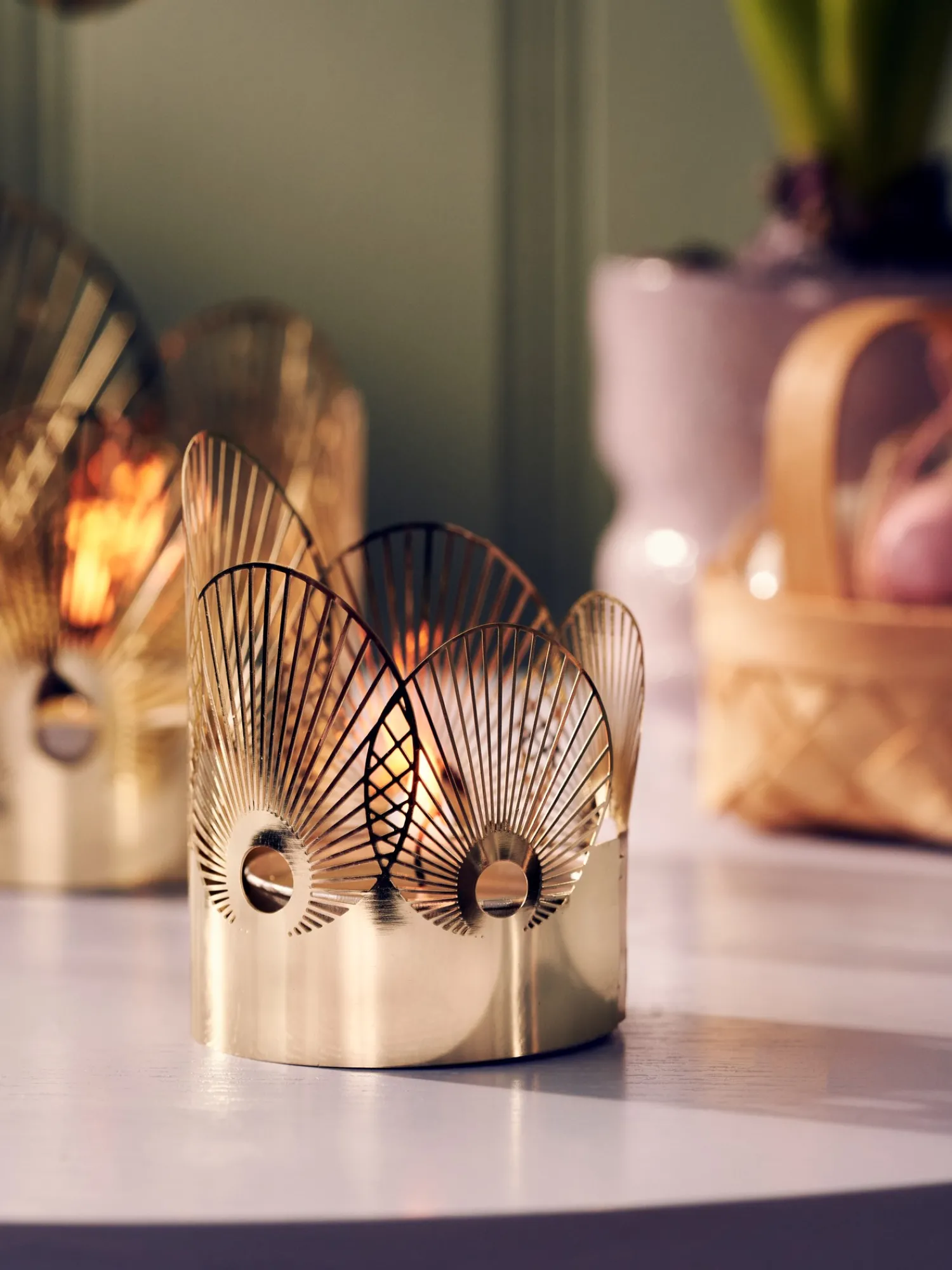 Den elegante telysholderen fra det svenske merket Pluto er et vakkert tilskudd til ethvert hjem. De gylne nettdetaljene reflekterer lyset på en vakker måte og skaper sjarmerende flimrende skygger.Søstrene legger vennlig til at denne holderen leveres med ett telys.
