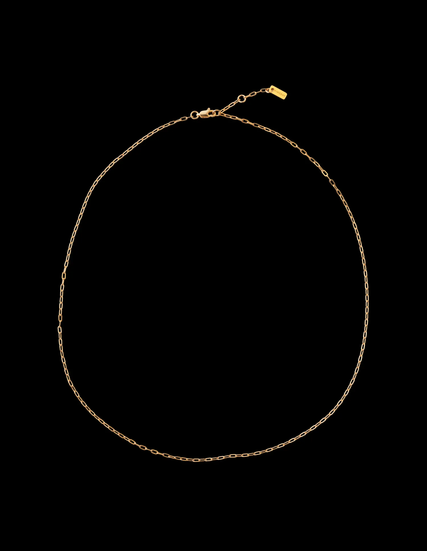 Søstrene minner vennlig om at dette produktet bare er tilgjengelig på nett. Basic Box Chain-halskjedet er laget av messing som er belagt med 2,5 mikron 18 karat gull. Lengden kan justeres fra 55 til 60 cm.«Bruk det som det er, eller gjør det til Deres eget ved å henge anheng i det», foreslår Anna entusiastisk. Anna og Clara minner vennlig om at De bør unngå direkte kontakt med fuktighet og væsker, slik at gullbelegget varer lenger. Søstrene anbefaler også at De oppbevarer smykkene Deres på et kjølig og tørt sted, fortrinnsvis i en lukket eske. I tillegg anbefaler søstrene alltid at De tar av Dem smykkene før De dusjer, trener eller legger Dem for kvelden, slik at den blanke overflaten bevares.