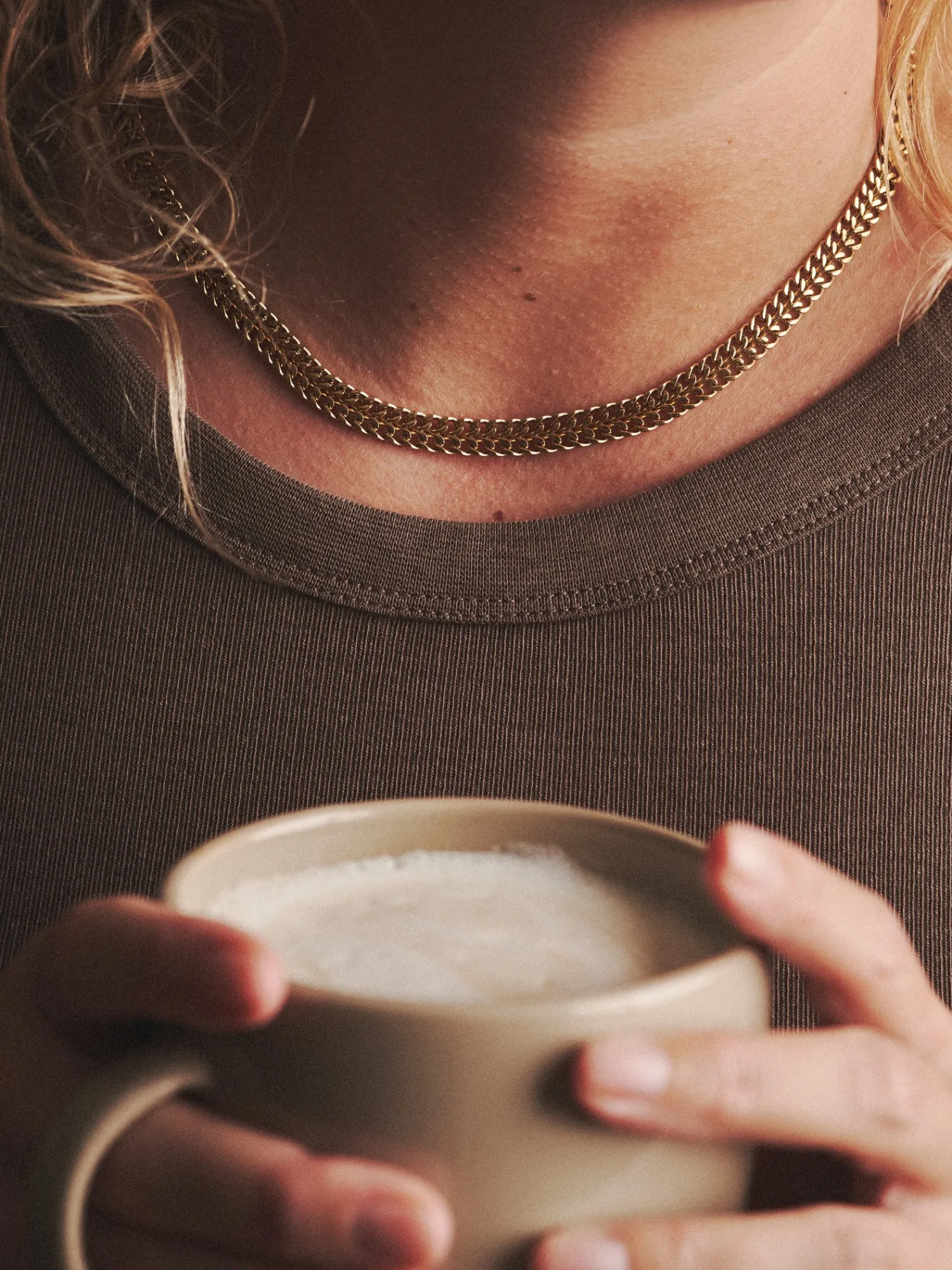 Søstrene minner vennlig om at dette produktet bare er tilgjengelig på nett.Halskjedet Geneve fra AndCopenhagen er laget av rustfritt stål som er belagt med 18 karat gull. Halskjedets lengde kan justeres mellom 30 til 35 cm, og det er 0,7 cm tykt.Anna og Clara minner vennlig om at De bør unngå direkte kontakt med fuktighet og væsker, slik at gullbelegget varer lenger.