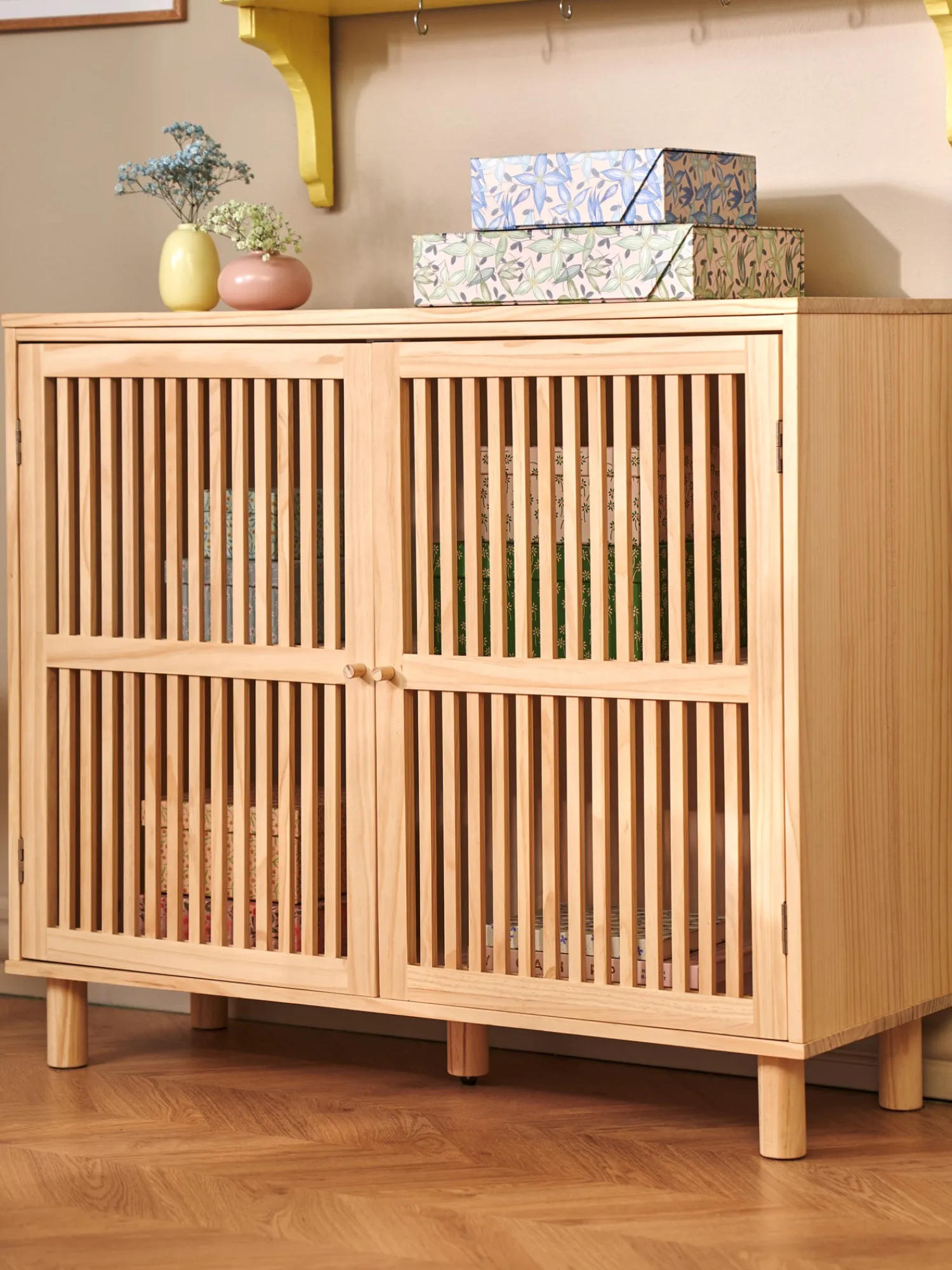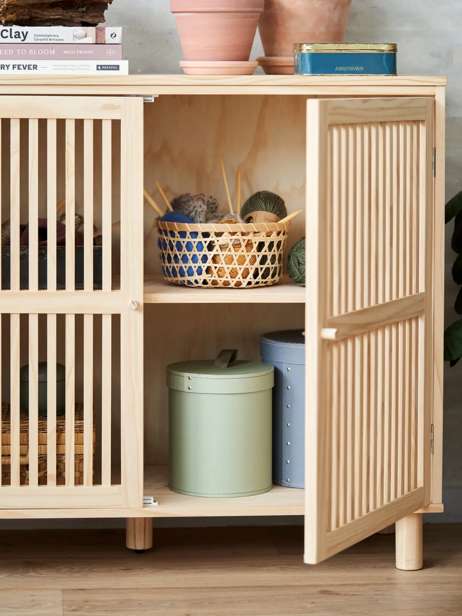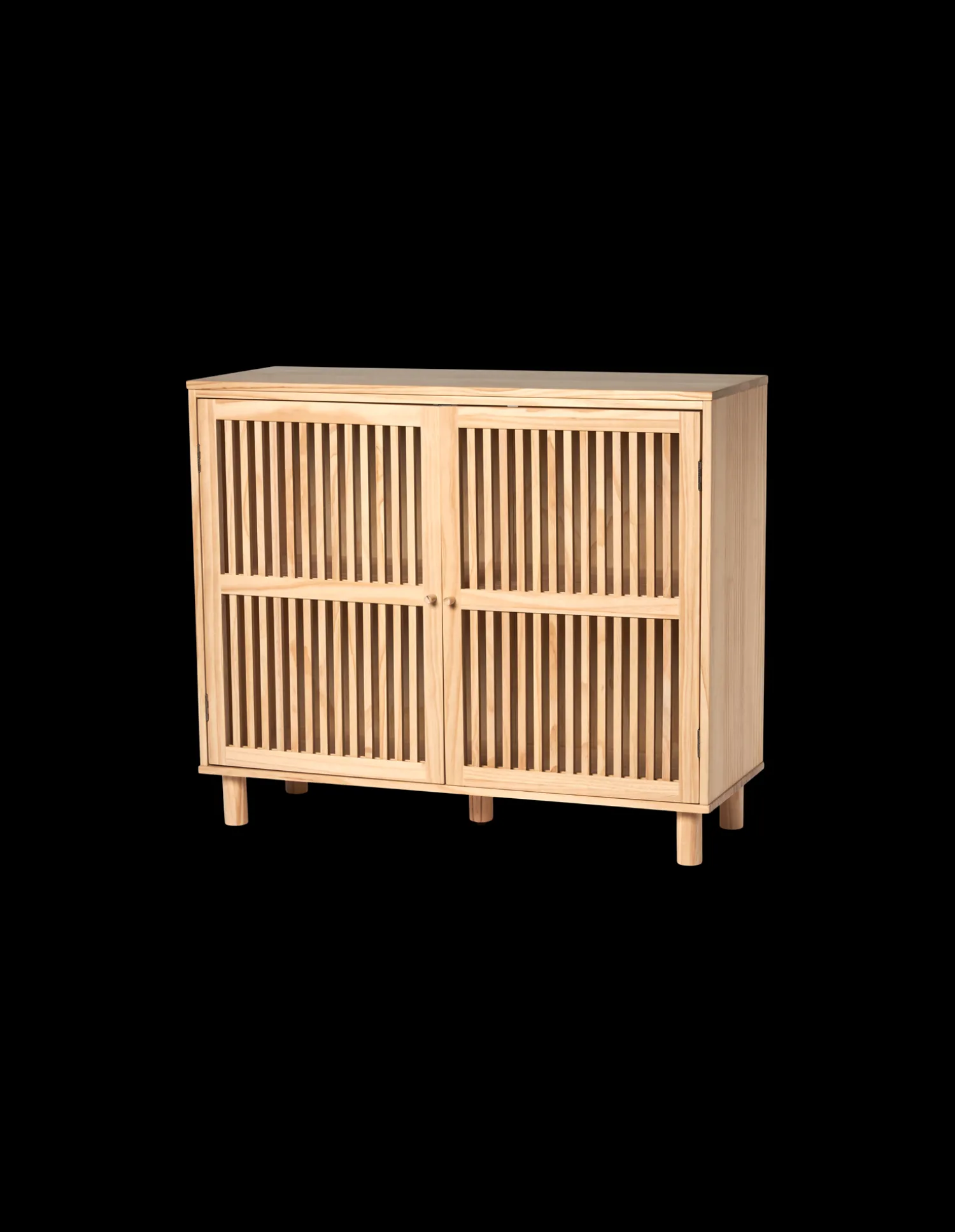 Søstrenes skap er laget av 100 % FSC®-sertifisert ubehandlet furu, og det er 95 x 35 x 80 cm.«Dette er simpelthen vidunderlig», utbryter Clara når hun får øye på det nye skapet som Anna har plassert i stuen. I det har hun plasser søstrenes juleservise, slik at det ligger trygt til julehøytiden nærmer seg.«Ja, treverket skaper en naturlig varme i rommet, og dørene skaper en nydelig eleganse», sier Anna med et smil.