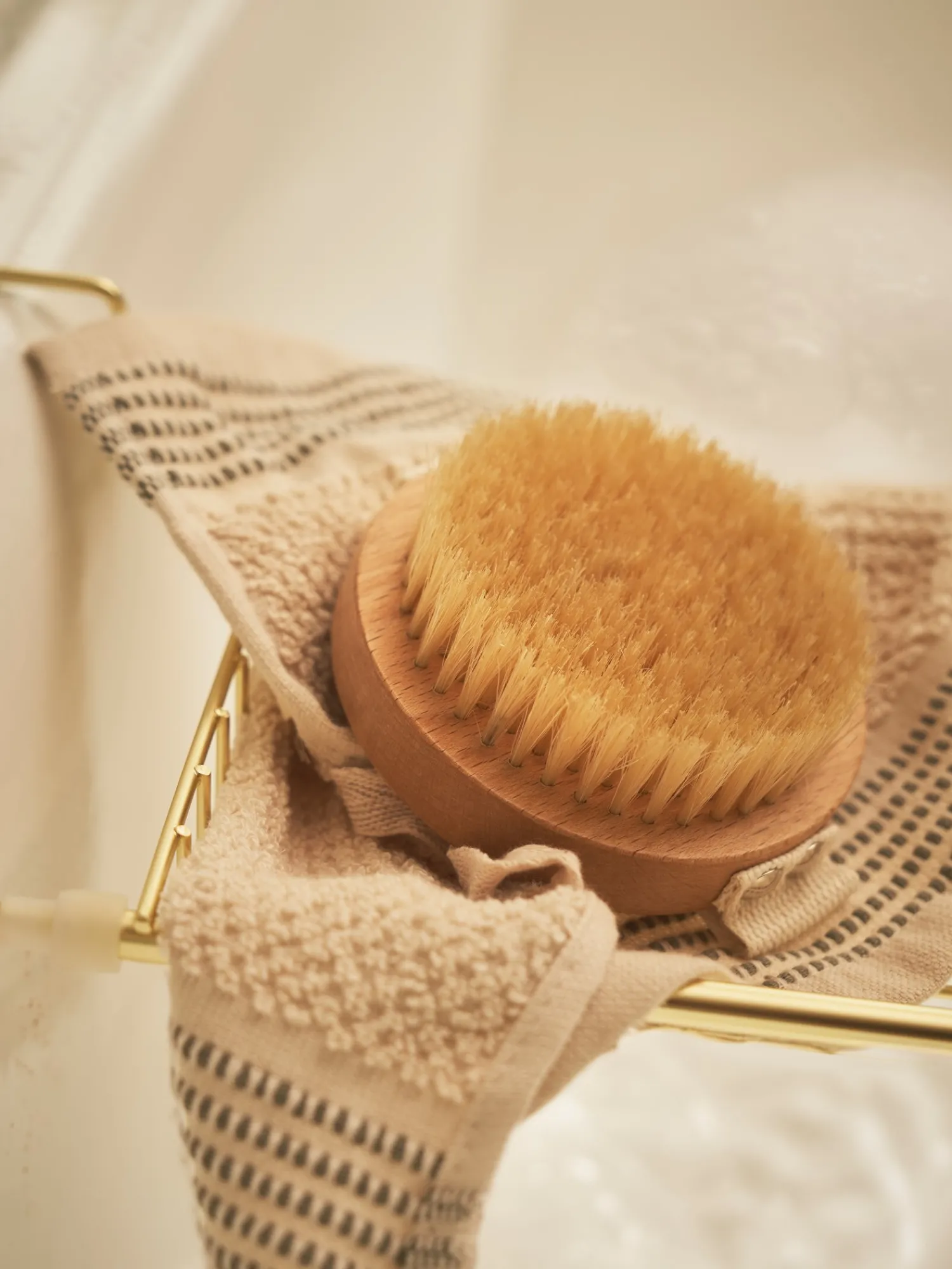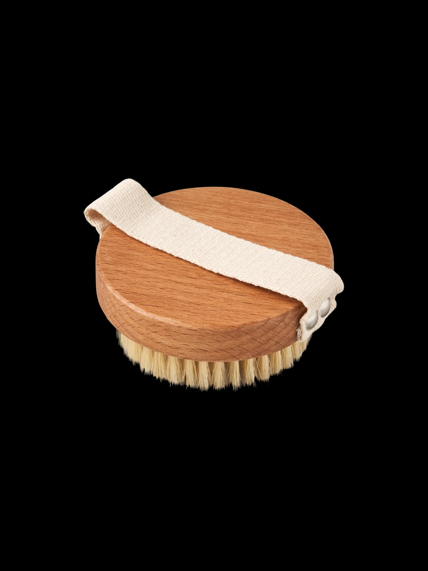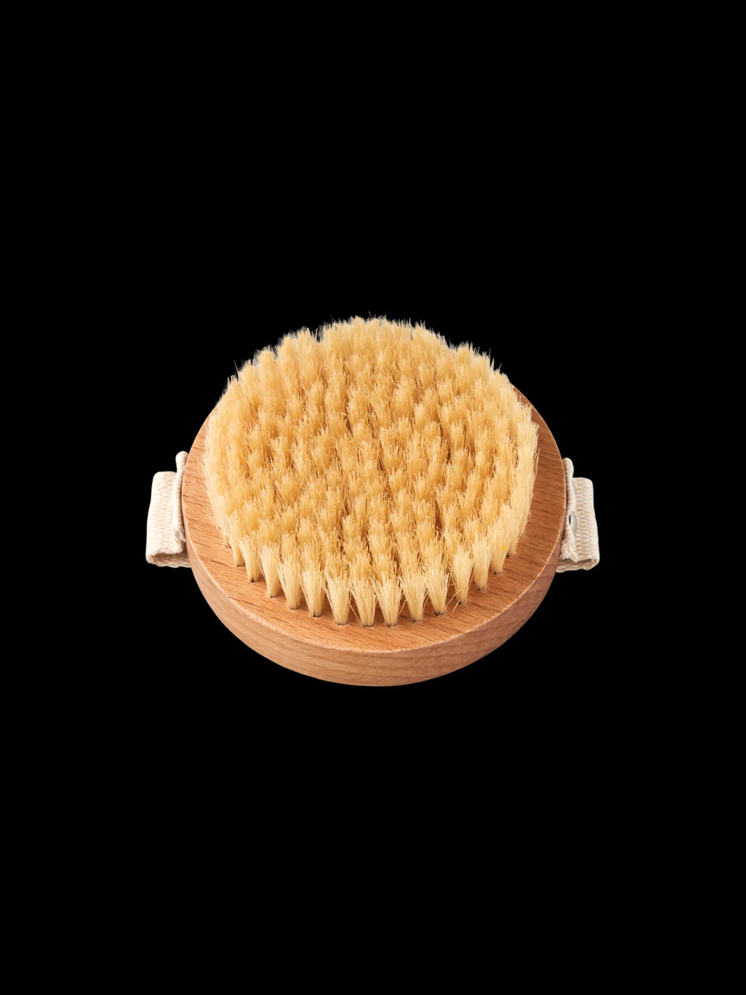 Søstrenes runde, tørre kroppsbørste er laget av 100 % FSC®-sertifisert bøk, og den har naturlig bust. Den har også en stropp for et godt grep.