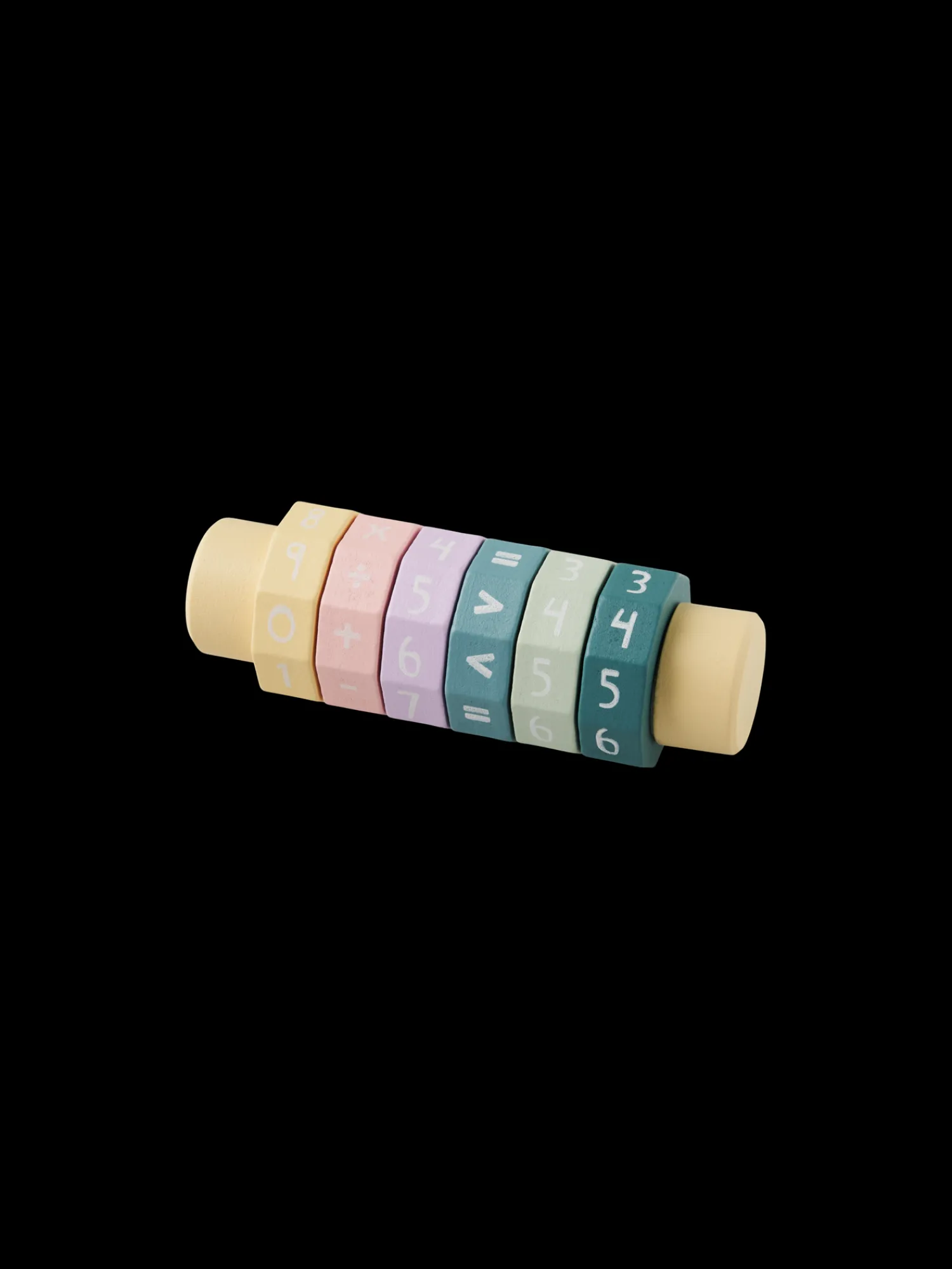 Søstrenes matematikkrull er laget av 100 % FSC®-sertifisert schima superba og MDF. Den er 4,9 x 5 x 14 cm.De kan lage ligninger ved å vri hjulene på rullen til tall og matematiske symboler.
