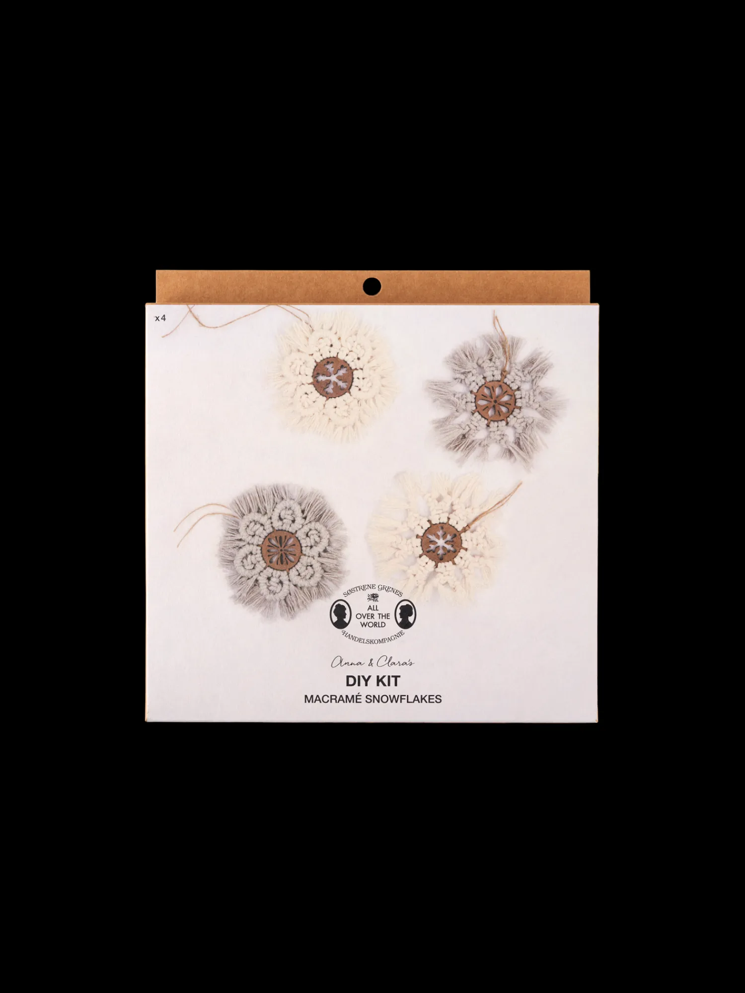 Søstrenes DIY-makramésett består av fire treplater, to makramégarn, ett hampgarn samt instruksjoner som viser hvordan De kan lage fire snøkrystaller.