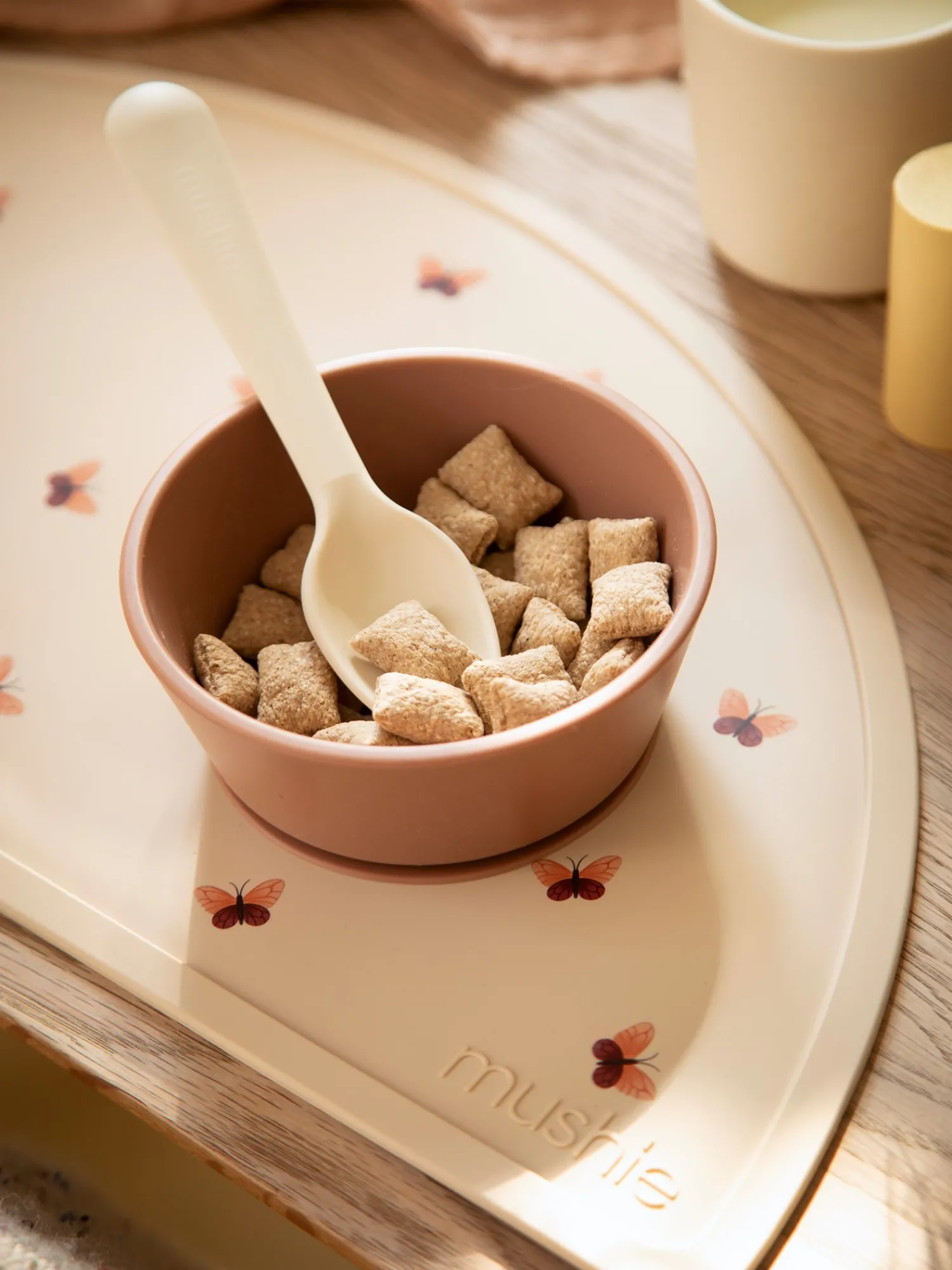 Denne skålen av silikon fra Mushie er designet i Sverige, og den har en sugekopp som holder den på plass, slik at det blir minimalt med søl når de søte små skal lære å spise selv. Den er laget av næringsmiddelgodkjent silikon.De to søstrene anbefaler at De vasker tallerkenen i varmt såpevann før bruk. De bør også sette den på en glatt, tørr og ren overflate, slik at den festes godt.Bollen skal alltid brukes under tilsyn av voksne. Kontroller produktet før bruk. Hvis det viser tegn på skader eller svekkelse, skal det kasseres. Ikke la barn bruke dette produktet uten tilsyn.